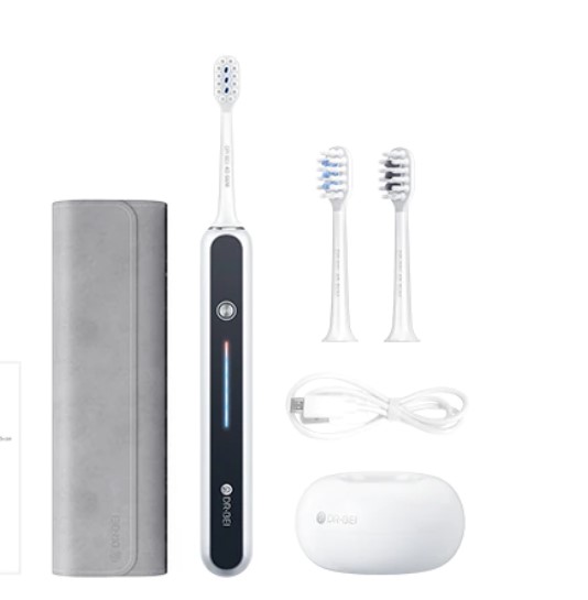 Электрическая зубная щетка Dr.Bei S7 — это флагманская модель в линейке Dr.Bei. Отличительные особенности: дизайн с комбинированными цветными вставками, беспроводная зарядка и кейс для хранения в комплекте. Количество колебаний двигателя — 40 000 раз в минуту.