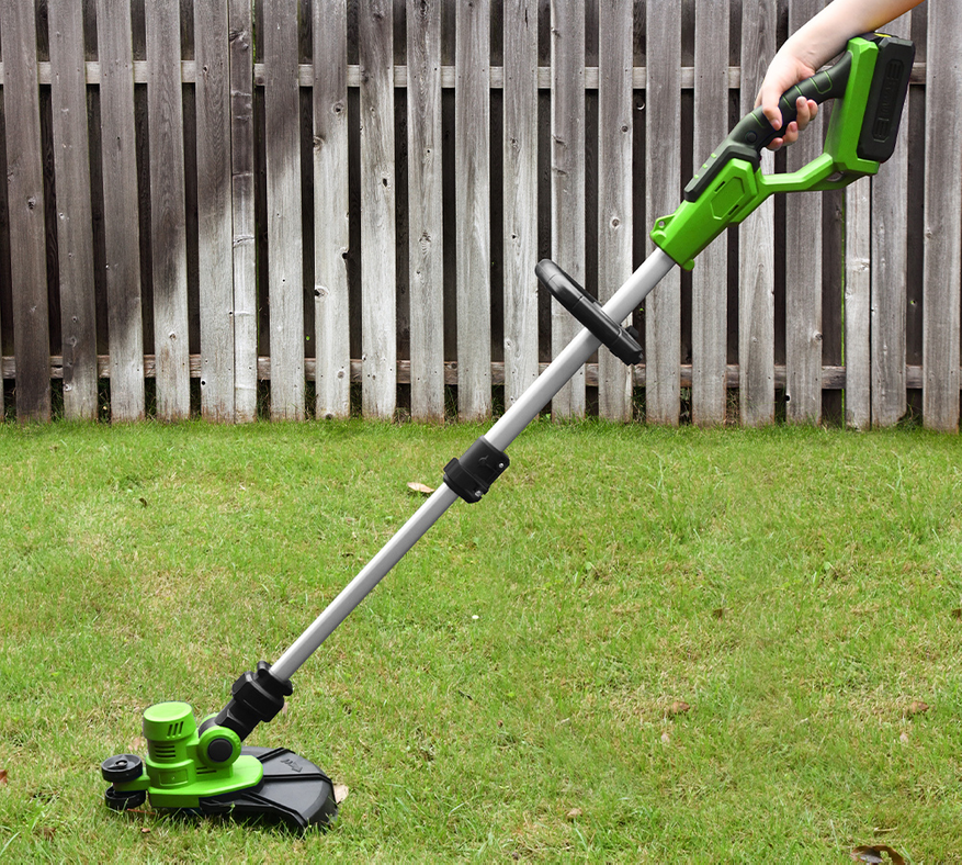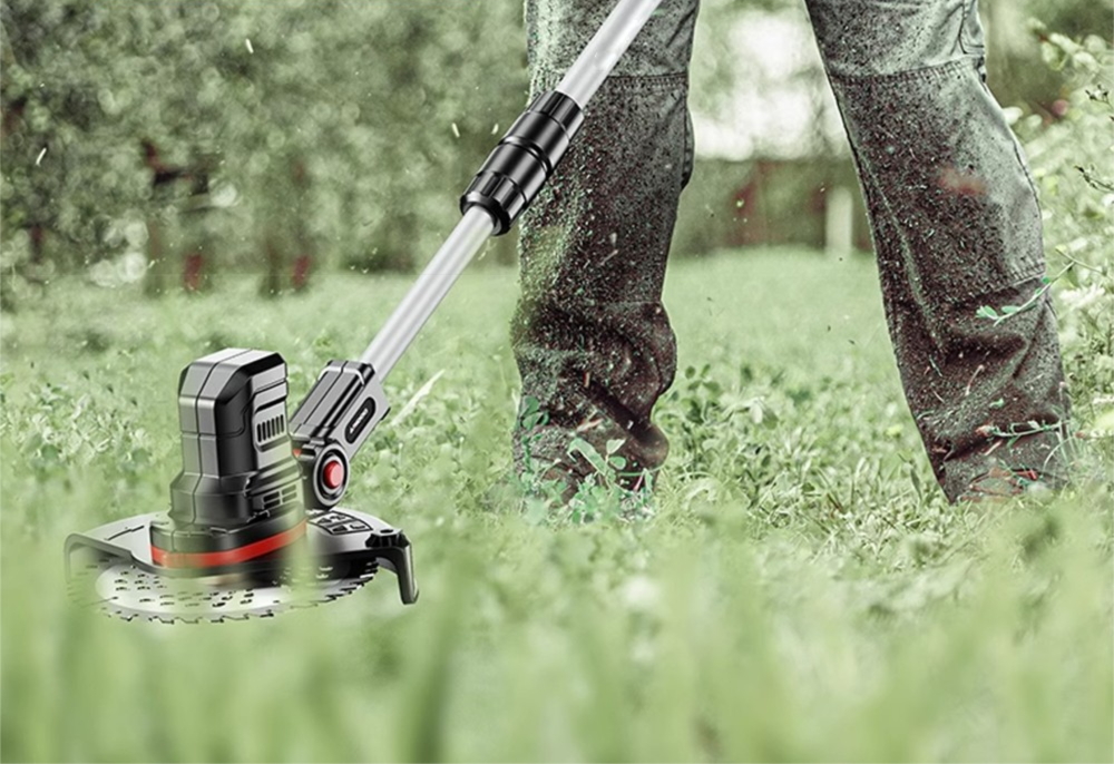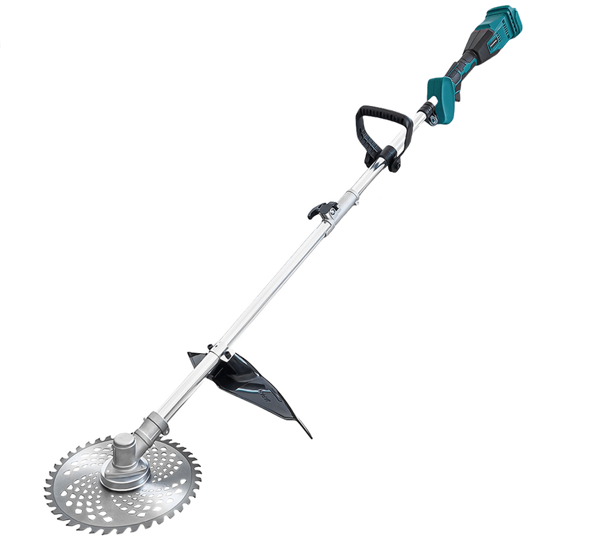 Беспроводной триммер с бесщёточным двигателем до 18000 об/мин. Ширина реза — 9 дюймов. Использует пластиковые и металлические лезвия, а также пильный диск. Режущая головка регулируется по углу в диапазоне 0-90°, телескопическая штанга — 105-140 см. Запуск через систему двойной блокировки. Есть защитный кожух для снижения контакта с растительностью. Аккумулятор 4000 мАч обеспечивает до 45-60 минут работы в зависимости от нагрузки.