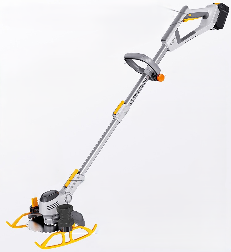 Инструмент с литий-ионным аккумулятором и регулируемой телескопической штангой. Режущая часть может изменять угол до 90°, что позволяет работать в труднодоступных местах. Управление реализовано через основную рукоятку с фиксатором и кнопкой запуска. На корпусе установлен индикатор заряда аккумулятора, в некоторых версиях — цифровой дисплей. Устройство рассчитано на обработку травы и сорной растительности. Аккумулятор съёмный, зарядка выполняется через отдельное устройство.