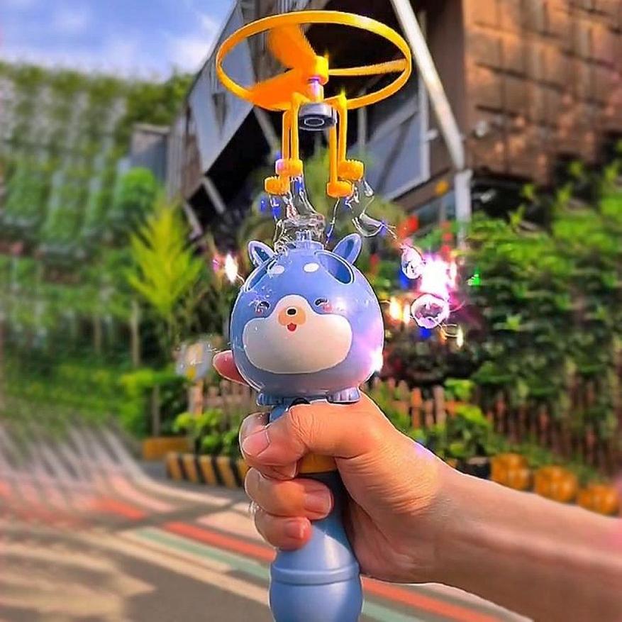 Новинка сезона — летающий вертолетик, выпускающий пузыри при взлете. Рукоятка раскручивает пропеллер, который оснащен четырьмя круглыми формами из которых, благодаря потоку набегающего воздуха, вылетают мыльные пузыри. Батарейки для работы пускателя не требуются.