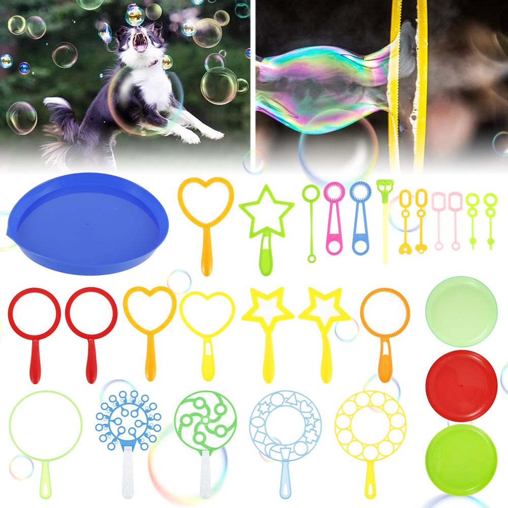 Большой набор пластиковых форм разного размера для изготовления пузырей различного размера и количестве за один раз. В комплект входит 28 предметов. Помимо форм, присутствует несколько плоских крышек, которые удобно использовать для мыльного раствора. Формы разных цветов и размеров.