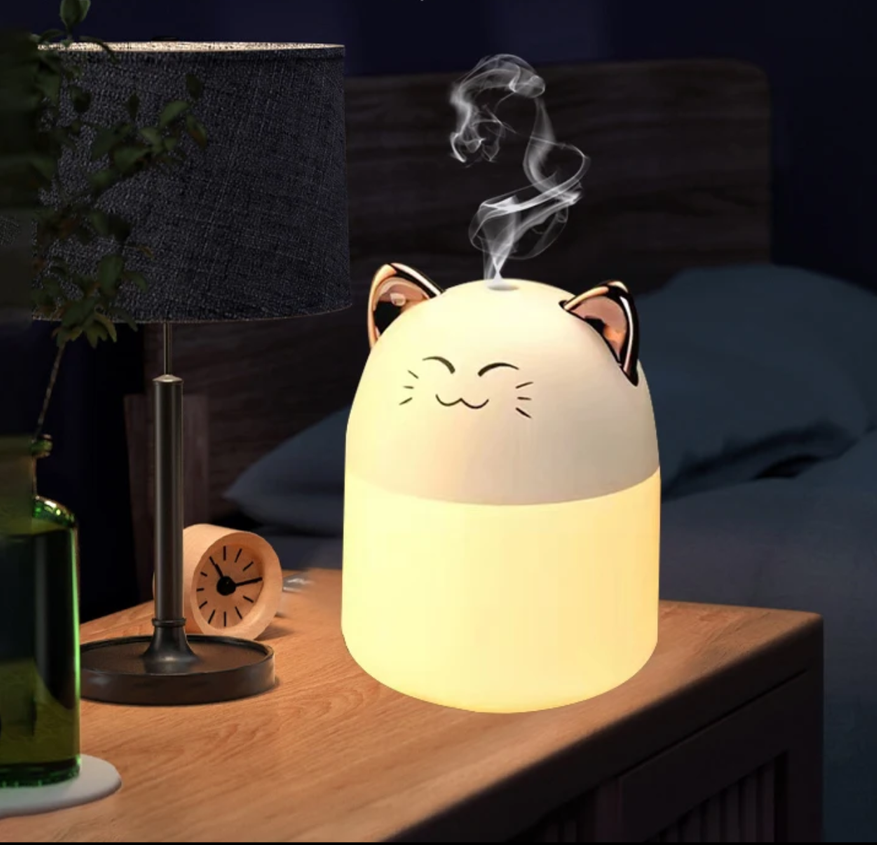 Для любителей котиков. Милый дизайн и простота использования. Размер у него небольшой, чуть больше ладони, весит меньше стакана воды, поэтому можно легко брать с собой в поездку или на работу. Резервуар рассчитан на 250 мл, чего хватает примерно на 10-12 часов работы. Внутри используется ультразвуковой распылитель, создающий мелкодисперсный туман. Он не смачивает поверхность вокруг. Есть два режима: постоянный и прерывистый, переключаются одной кнопкой. Питание подается через стандартный USB, можно подключить к ноутбуку или павербанку. Работает тихо, менее 36 дБ, можно спокойно оставлять включенным ночью. Корпус пластиковый, доступен в двух цветах, белом и розовом. На «ушках» мягкая подсветка, которая создает уютный вечерний свет. Это не только про функциональность, это и симпатичная деталь интерьера, если вы любите кошек и хотите добавить немного теплоты в обстановку.