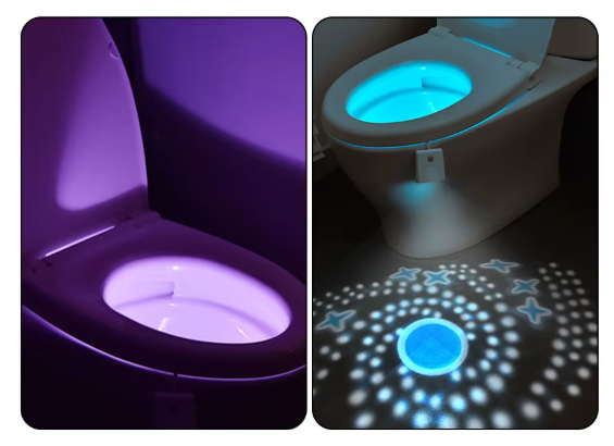Светильник разработан для установки на ободок унитаза, при этом положение датчика регулируется. Он оснащен полноцветной RGB-подсветкой и функцией проекции «звездного неба» на пол около сантех.прибора.