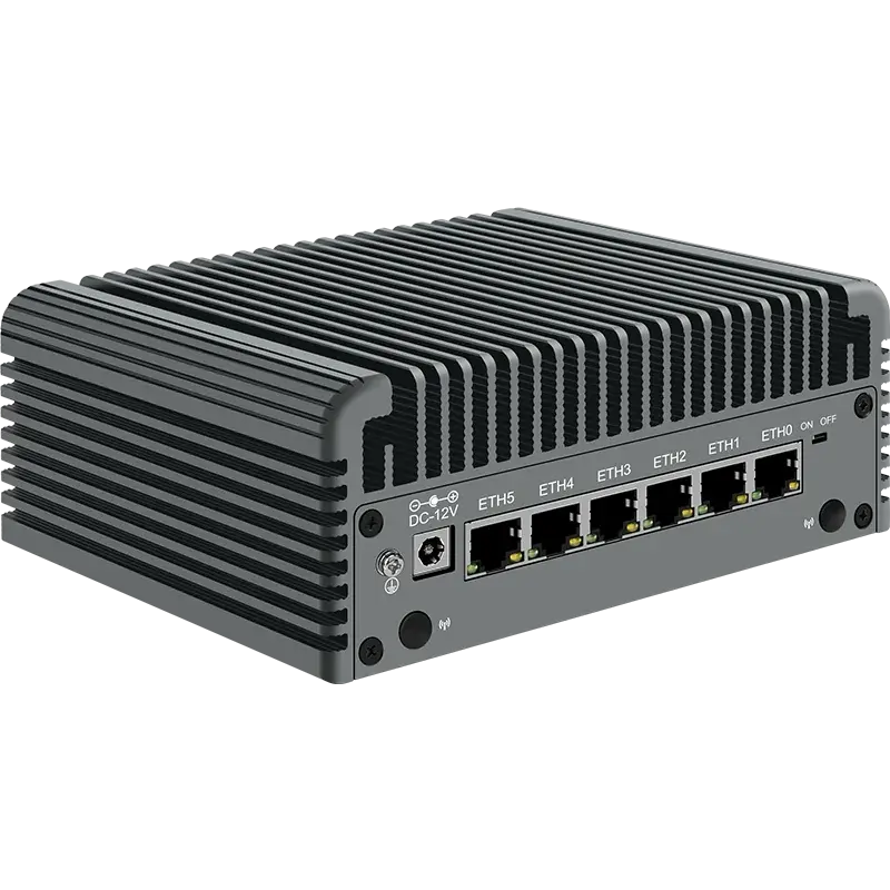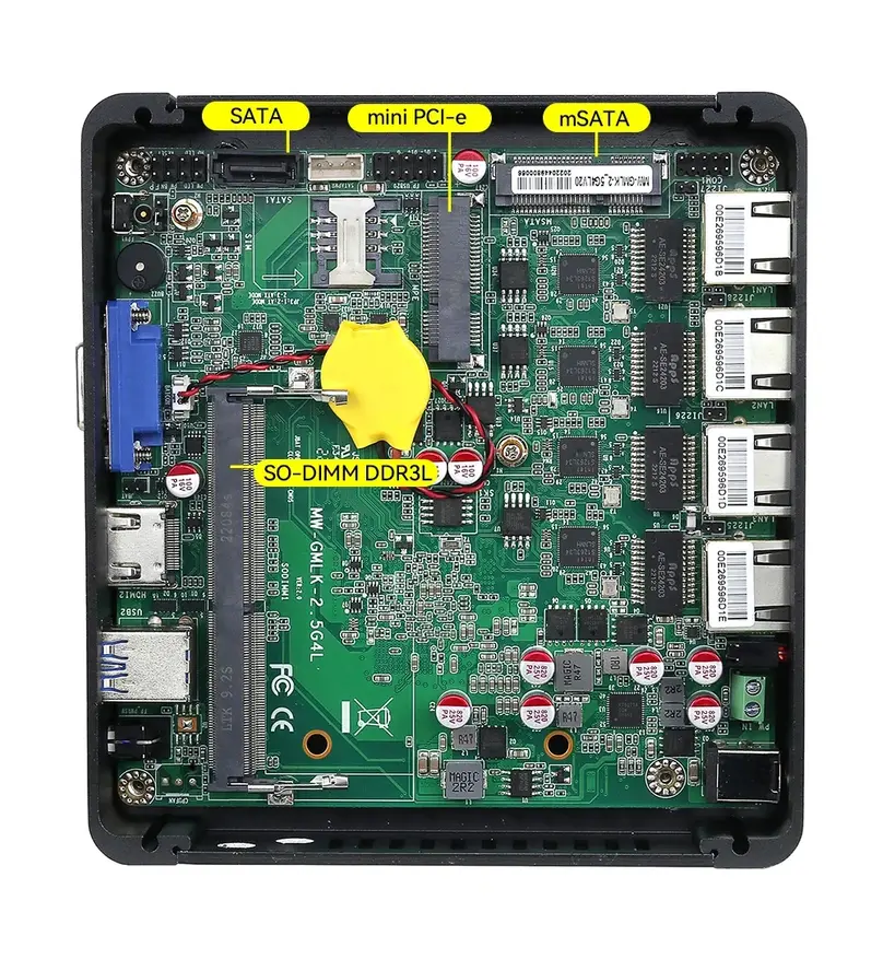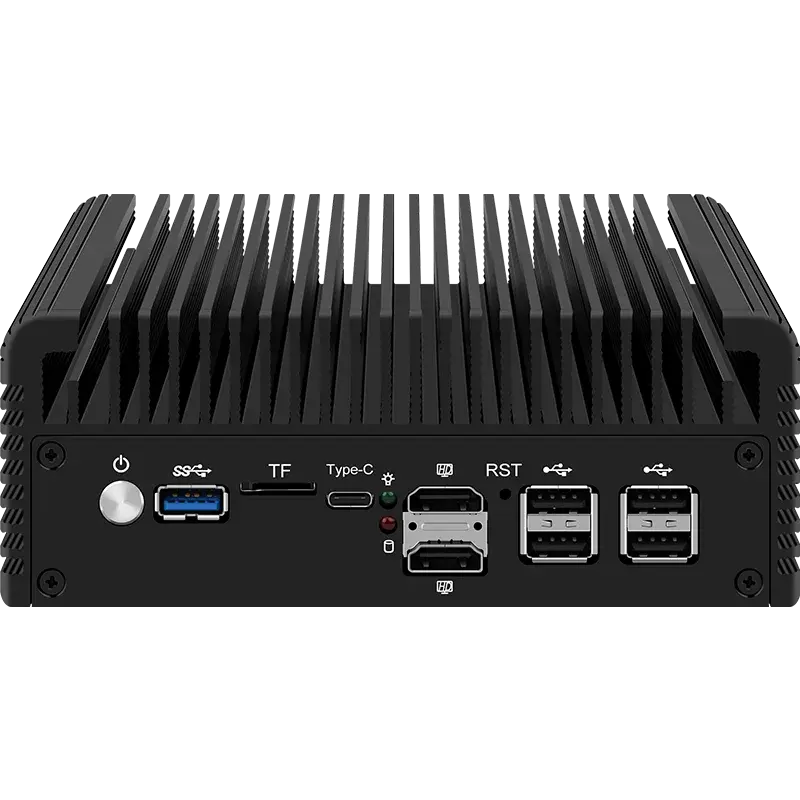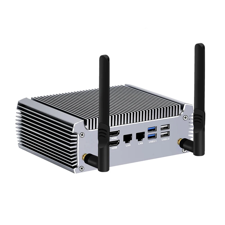 Открывает подборку мини-ПК размером 135 x 129 x 40 мм, который предлагает редкую для столь компактных решений конфигурацию — четыре гигабитных Ethernet-порта на базе Intel i225V/i226V 2.5G. Внутри работают процессоры Intel Celeron J1900 (4 ядра, до 2.42 ГГц) или N2830 (2 ядра, до 2.41 ГГц) с поддержкой до 8 ГБ DDR3L памяти.