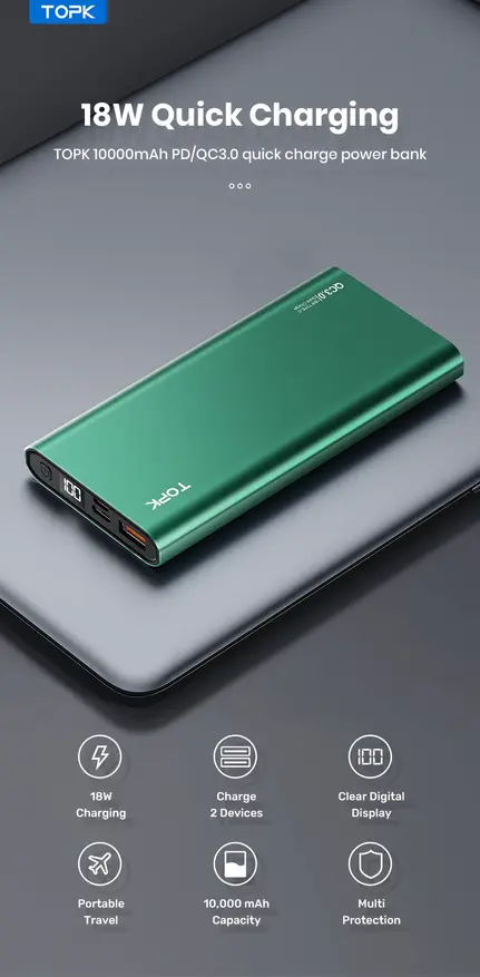 Павербанк TOPK на 10000 мАч и 18Вт с цифровым дисплеем