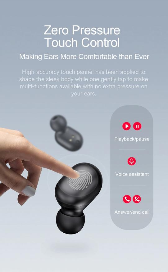 - Присутствует сенсорные кнопки для остановки треков, вызова голосового ассистента, принятия звонка