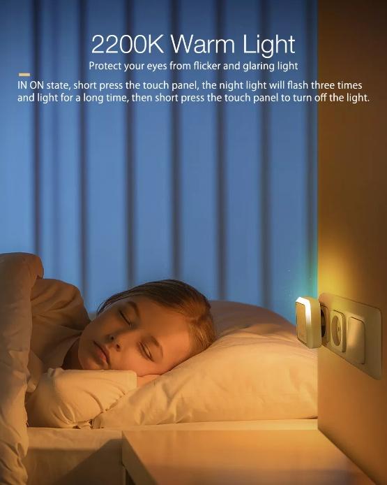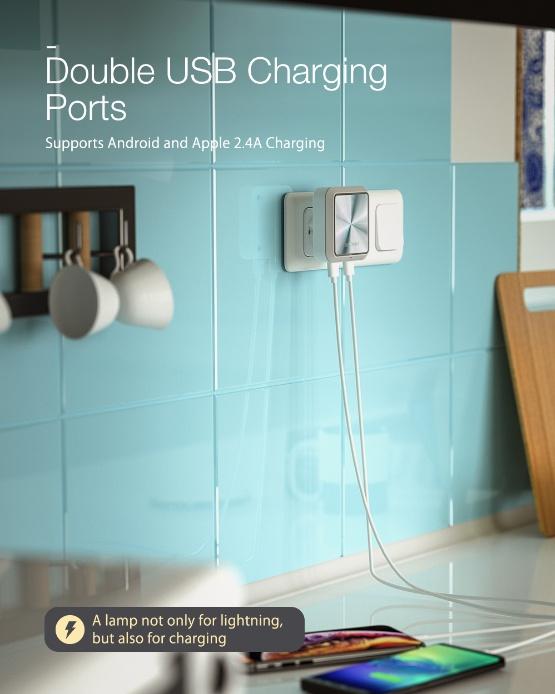 Небольшой ночничок включающийся в розетку 220В, обеспечивает неяркую подсветку окружающего пространства. Кроме этого, имеет два встроенных USB порта для зарядки гаджетов (до 1.2А на порт, суммартно 2.4А). Подсветка включается только при отсутствии внешнего освещения. Размер: 70*70*25mm, вес: 65г. Цветовая температура: 2200К, мощность: 1.2W~1.5W