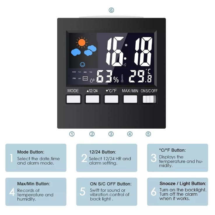 Моделька попроще, но и подешевле той, что вверху, инверсный дисплей (белые циahs на темном фоне). Отображает время, температуру (0~50С° )и влажность внутри помещения, есть будильник, а также возможность посмотреть min/max температуру и влажность за последние 12 часов. Размер: 92x92x50mm. Питание: 2xAAA