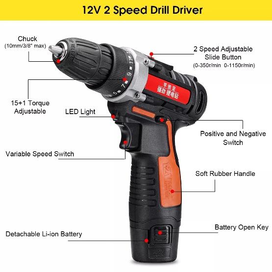 Батареи Li-Ion, 2 скорости вращения патрона, заявлена fast charge зарядка 30 минут для 12V) ,50 минут для 24V, 15+1 уровней регулировки момента затягивания (+сверление). Патрон самозатягивающийся, защита от перегрузки, диаметро сверл до 10мм, подсветка рабочей зоны. Скорость вращения: 0-350,0-1150r/min(12V); 0-350,0-1350r/min(24V). В комплекте с 12Вольтовым идет еще насадка для закручивания винтов в труднодоступных местах.