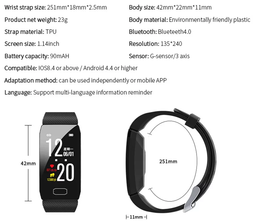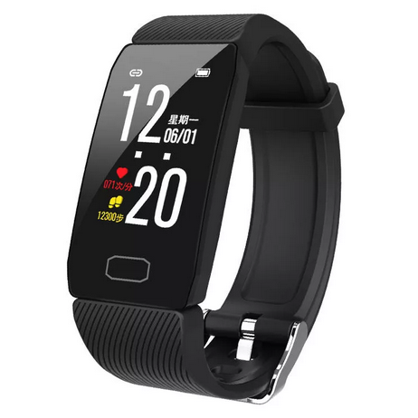 Имеет 0.96-дюймовый цветной дисплей. Есть шагомер, пульсометр и датчик кровяного давления, можно смотреть статистику физической активности в приложении на смартфоне. Кроме этого, на экране отображаются уведомления о звонке / сообщениях. Уровень водозащиты IP67 (выдержит брызги, но плавать в нём не рекомендуется). Ремешок сменный, сделан из TPE (термопластичного каучука).