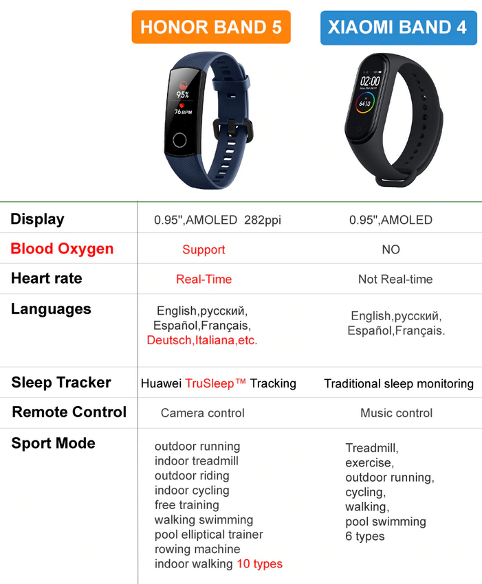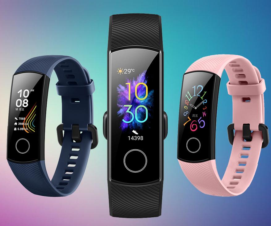 Honor Band 5 оснащён AMOLED-дисплеем с диагональю 0.95 дюймов (разрешение 240х120 пикселей). Среди особенностей дизайна стоит отметить изогнутое стекло. Браслет может мерять насыщение крови кислородом, а также пульс (есть режим постоянного измерения), количество пройдённых шагов, сожженные калории и прочее. Есть 10 спортивных режимов. Защищён по уровню 5АТМ (в нём можно купаться и плавать).