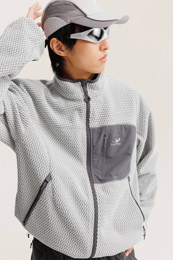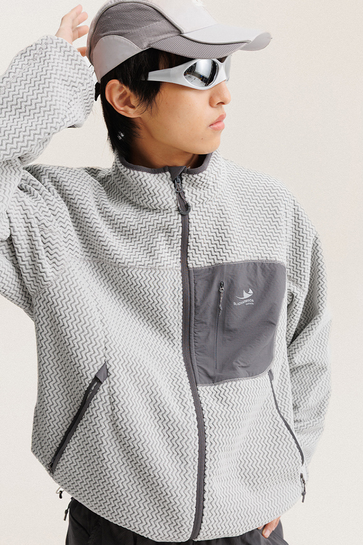 Куртка выполнена из полиэстера с флисовой структурой, рассчитанной на сохранение тепла и базовую защиту от ветра. Конструкция включает центральную молнию и воротник-стойку, а также систему карманов: нагрудный, два на рукавах, два боковых и два внутренних. Манжеты регулируются с помощью застёжек, предусмотрена регулировка по нижнему краю. Материал имеет мягкую текстуру, устойчив к износу и рассчитан на использование в прохладных погодных условиях. Размерная сетка соответствует азиатским стандартам.
