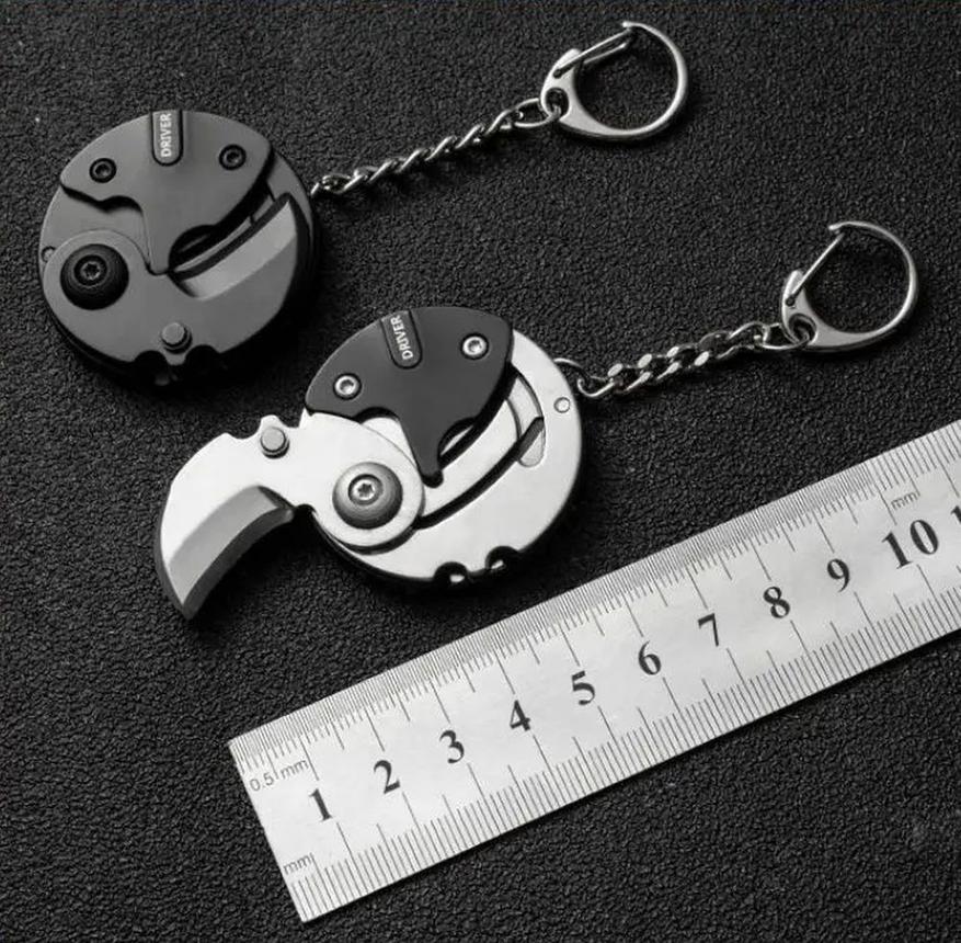 Крайне необычный и продуманный по своей конструкции брелок-трансформер. На странице товара два варианта исполнения. В сложенном виде представляет из себя круглую или шестигранную плоскую штучку, в которой спрятаны несколько разных инструментов. В состав входят: лезвие, стропорез, разные типы отверток, а также небольшая линейка и ключи под шестигранные винты, что будет полезно, например. велосипедистам. Есть даже небольшой магнит.
