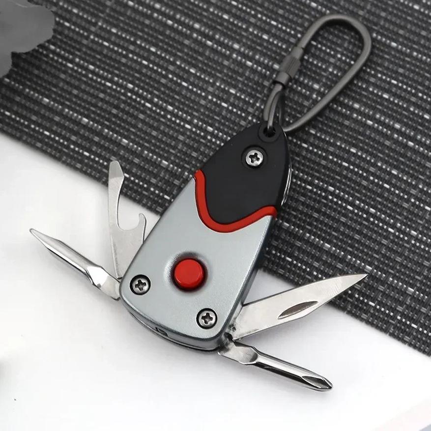 Неплохой брелок в формате мультитула со складными инструментами, а также светодиодным фонариком на торце. В состав инструментов брелка входят: небольшое лезвие, открывашка, плоская отвертка, крестовая отвертка. По центру находится кнопка для включения светодиода, удобно когда нужно, например, подсветить замочную скважину или найти упавший предмет.
