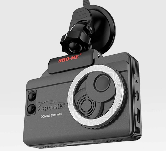 Довольно оригинальный внешний вид имеет комбо-видеорегистратор от компании Sho-Me. Это комбинированная модель в компактном корпусе, оснащенная модулем GPS, детектором радаров (в том числе и лазерные диапазоны). Из особенностей выделю наличие модуля для беспроводной связи со смартфоном (WiFi) и фирменное приложение для просмотра роликов и обновления баз.