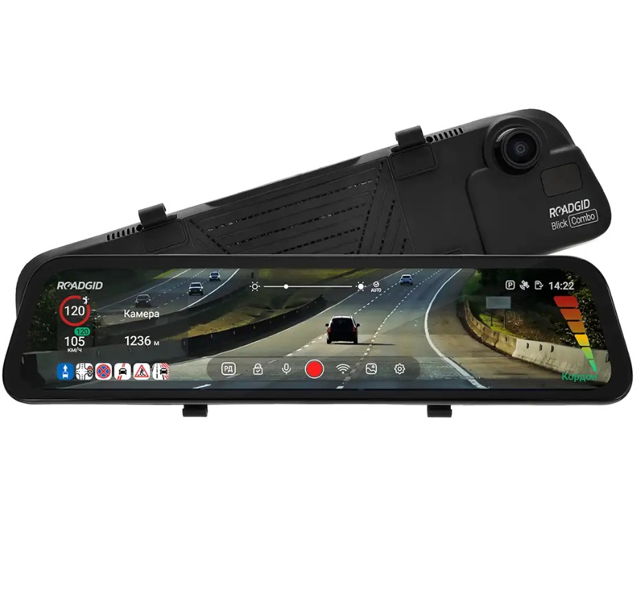 На этот раз открывает подборку свежая модель комбинированного радар-детектора, видеорегистратора и GPS-информера от бренда Roadgid. Речь идет про Roadgid Blick Combo в формате зеркала с дисплеем. Отмечу основной сенсор Sony Starvis IMX327, обеспечивающий четкую запись даже ночью (важно для доказательств в спорных ситуациях). Обновление баз, то есть скачивание с оф. сайта и загрузка свежих в устройство, осуществляется через смартфон и фирменное приложение. Также приложение дает удаленный доступ — просмотр записи через смартфон (например, после ДТП). Предусмотрен режим парковки — запись при ударе или движении вокруг авто (есть модели с автономным питанием). Да и устанавливать такое устройство проще — достаточно закрепить его корпус на салонном зеркале автомобиля.