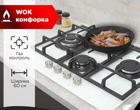 Газовая варочная панель предназначена для установки на кухнях с нишей глубиной от 45 до 55 см и шириной от 470 до 659 мм. Модель оснащена четырьмя конфорками, включая конфорку WOK. Рабочая поверхность выполнена из закаленного стекла. Есть функции газ-контроля и электроподжига. Установка времени не поддерживается. Панель имеет водонепроницаемую конструкцию.