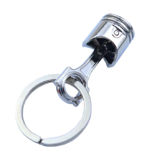 Брелок в форме автомобильного поршня от JAVRICK, изготовленный из цинкового сплава. Конструкция включает элементы с шипами и выполнена в деталях, повторяющих форму настоящего поршня. Головка поршня подвижна и не закреплена жестко на шатуне, что позволяет имитировать работу механизма.