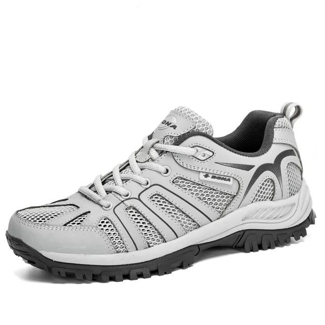 Отдельные детали обуви: спереди расположили защитную нашивку, прикрытую мыском подошвы, сделали быструю шнуровку и утяжку на заднике, уязвимые участки прошили двойными строчками, а подошву снабдили выраженным протектором.