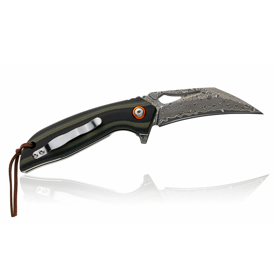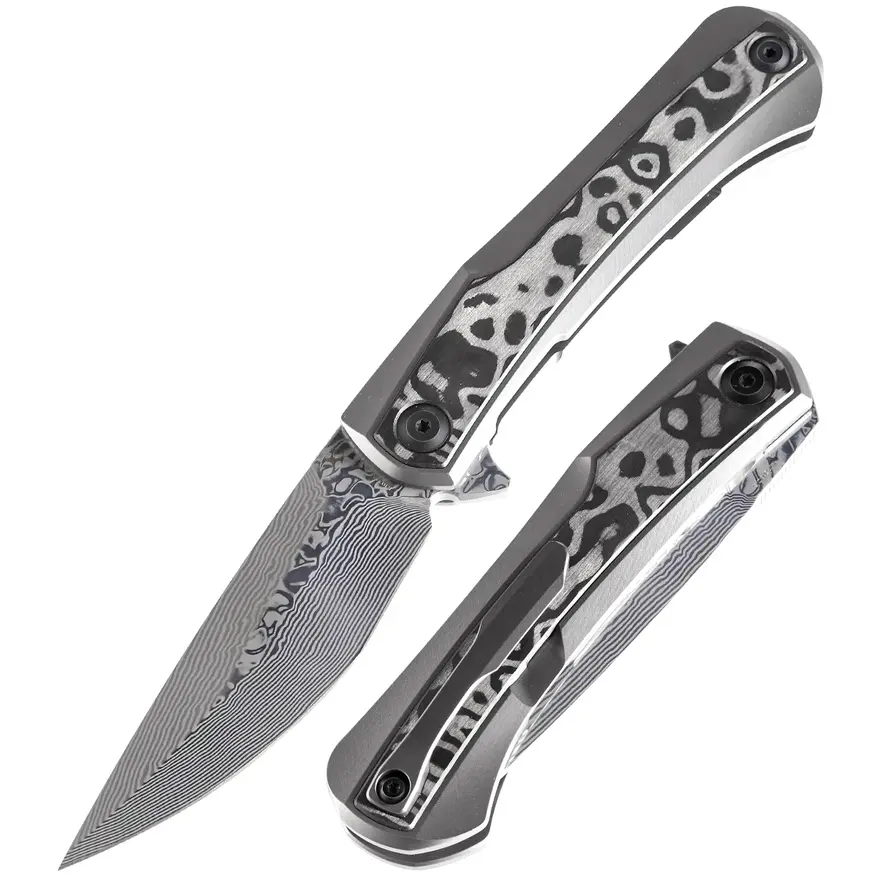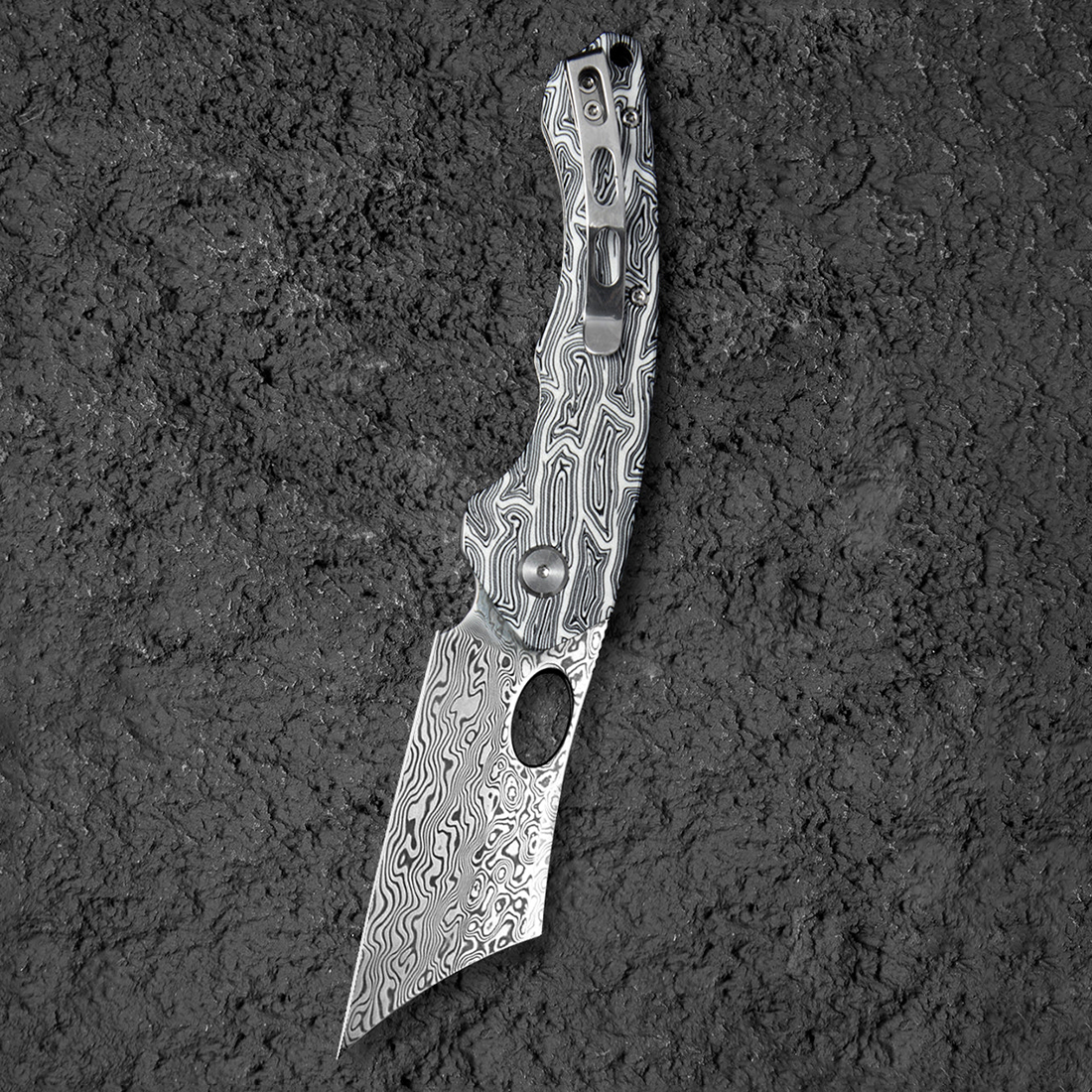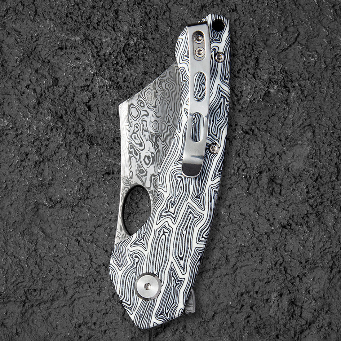 Флиппер с клинком длиной 82 мм в стиле мини-тесака привлекает необычной геометрией и агрессивным дизайном. Дамасская сталь сочетается с рукоятью из чёрно-белого G-Mascus (разновидность стеклотекстолита G10), создавая контрастный и запоминающийся внешний вид.