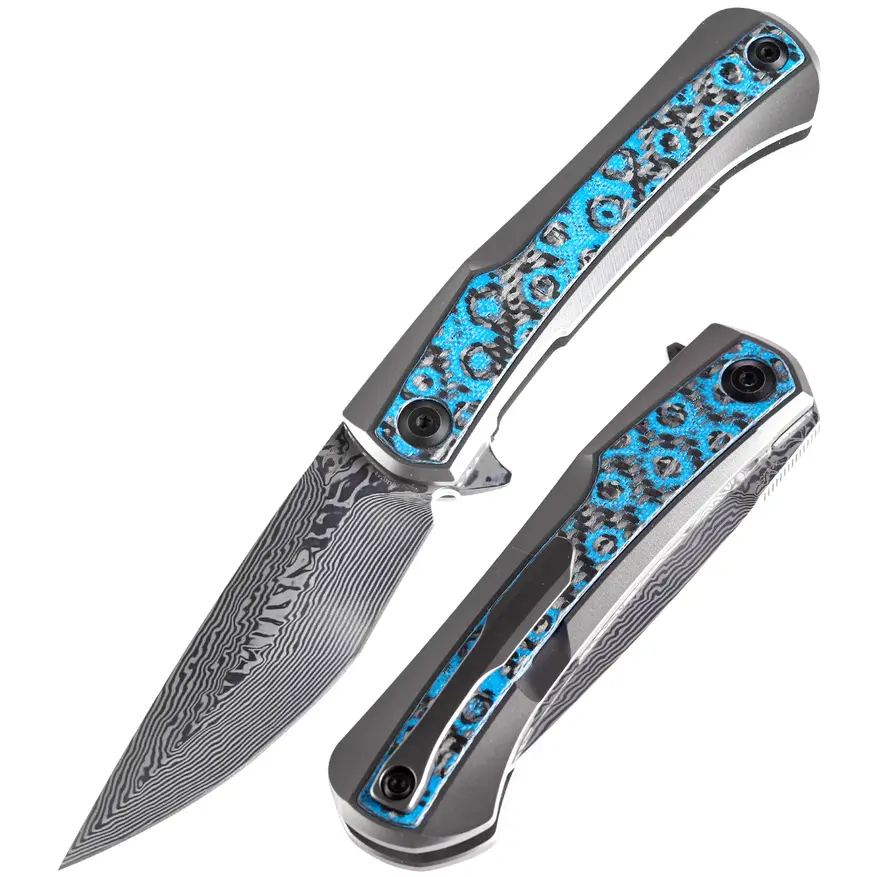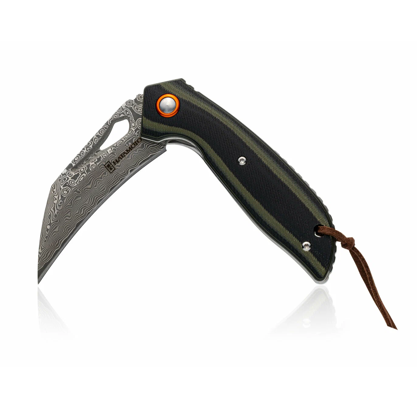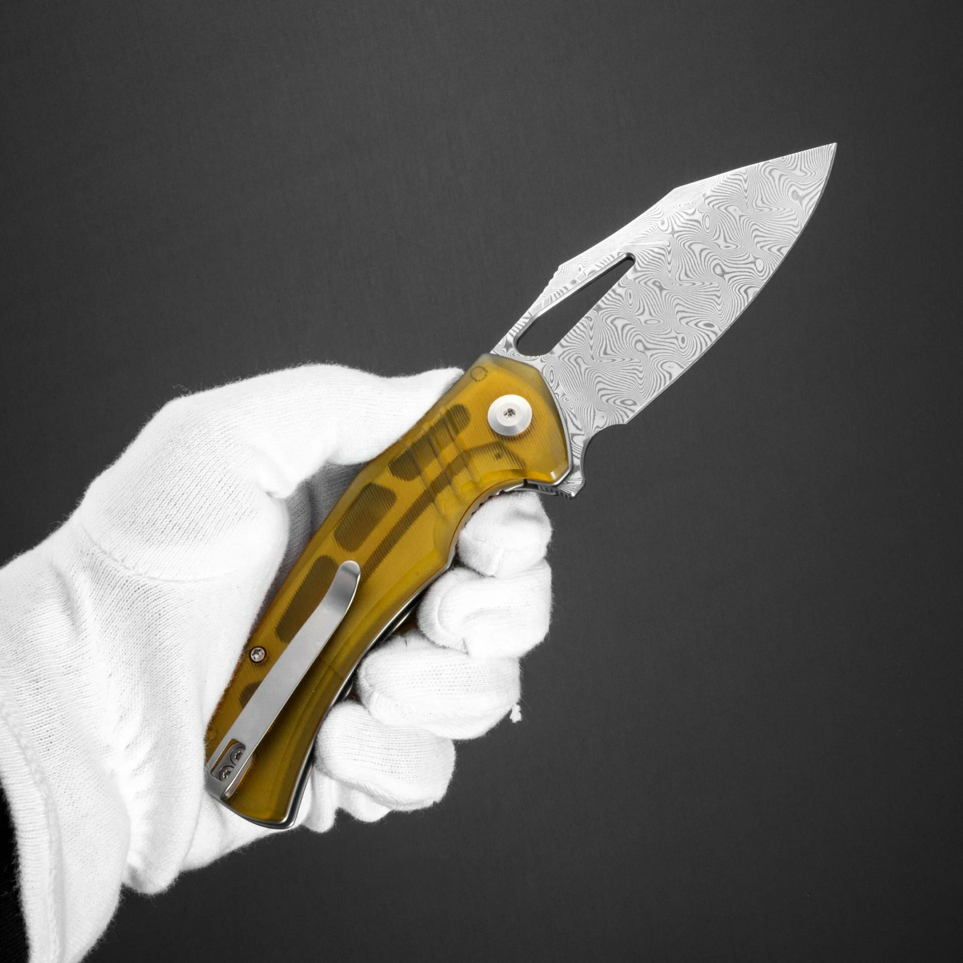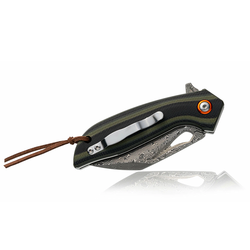 Флиппер с клинком длиной 82 мм в стиле мини-тесака привлекает необычной геометрией и агрессивным дизайном. Дамасская сталь сочетается с рукоятью из чёрно-белого G-Mascus (разновидность стеклотекстолита G10), создавая контрастный и запоминающийся внешний вид.