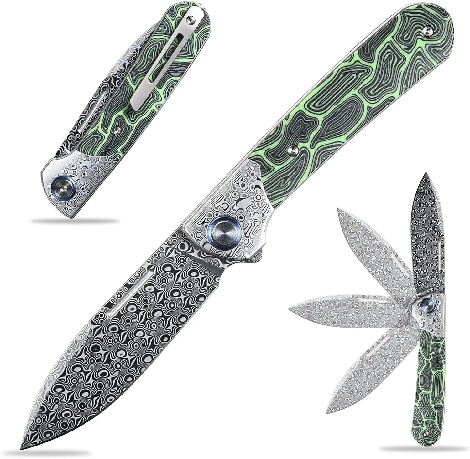 Японская модель с клинком длиной 78 мм выполнена из дамасской стали со 110 слоями VG-10, что обеспечивает исключительную остроту и долговечность режущей кромки. Твердость — 61 HRC, масса — 130 г. Рукоять из композита G10 отличается лёгкостью и устойчивостью к влаге, делая нож идеальным для использования в сложных условиях.
