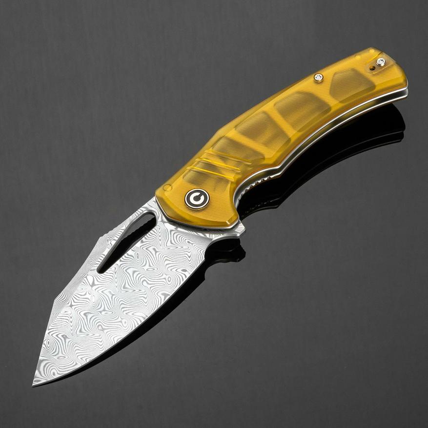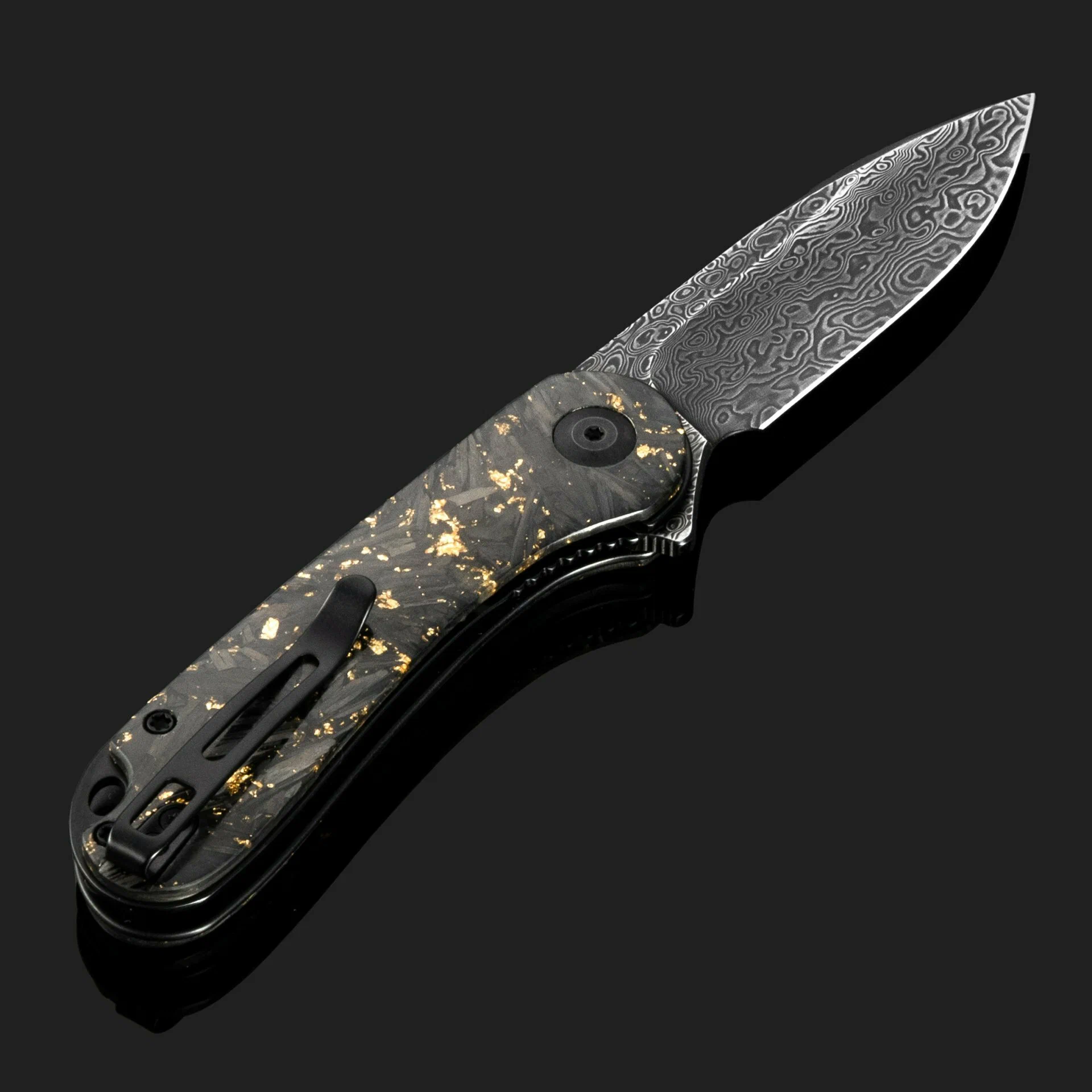 Популярная брендовая модель в исполнении с дамасским клинком и рукоятью с текстурой измельчённого золотистого карбона демонстрирует современный подход к дизайну EDC-ножей. Компактные размеры (лезвие 75.2 мм, длина в сложенном состоянии — 102.4 мм) и низкий вес (77.7 г) делают нож идеальным EDC-спутником для городского жителя.