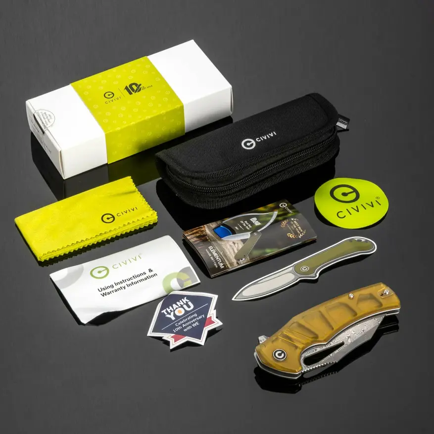 BullTusk весит чуть менее 120 г, лезвие длиной 88.4 мм из дамасской стали характеризуется твердостью в 58-60 HRC. Необычная геометрия клинка с характерным изгибом обеспечивает эффективный рез при работе с различными упаковочными материалами. Модель привлекает оригинальным дизайном и качественной сборкой, типичной для продукции CIVIVI.