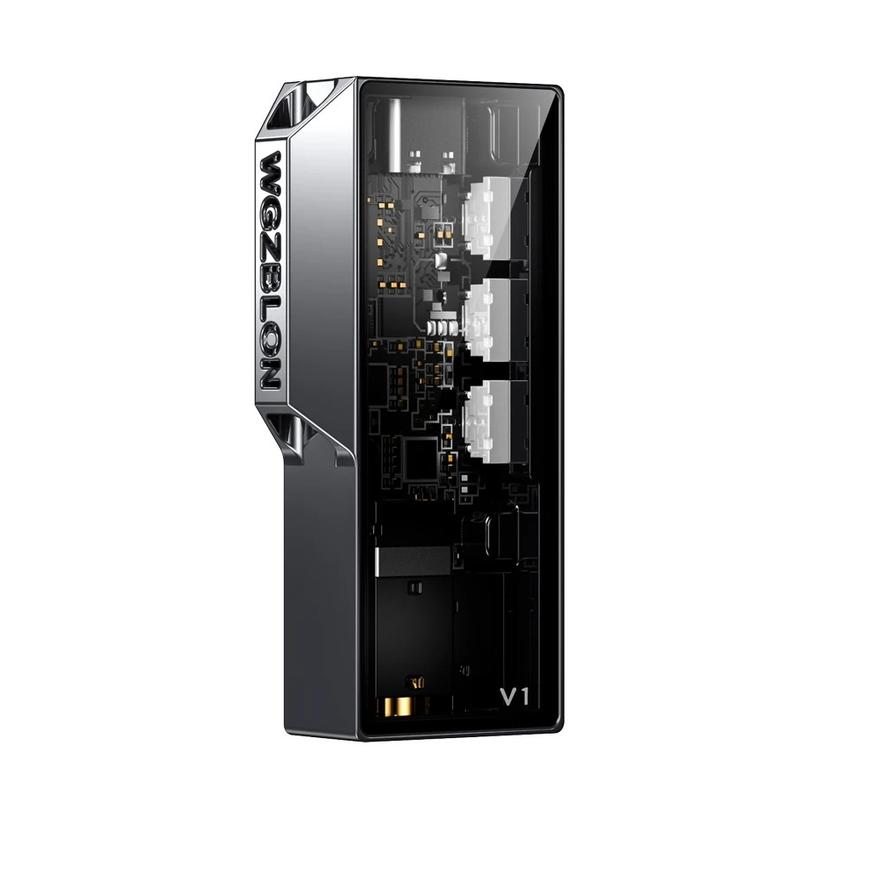 Красавец Blon V1 порадует всех любителей гравировок, окошек и фирменных скосов. Из особенностей у него два выхода на наушники, три кнопки управления, приятно окрашенный свет диода, 32 бит 384 кГц и DSD256 в качестве разрешения и 160 мВт мощности на балансном выходе. Простой, легкий и максимально удобный.
