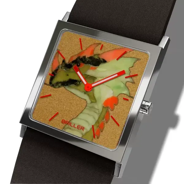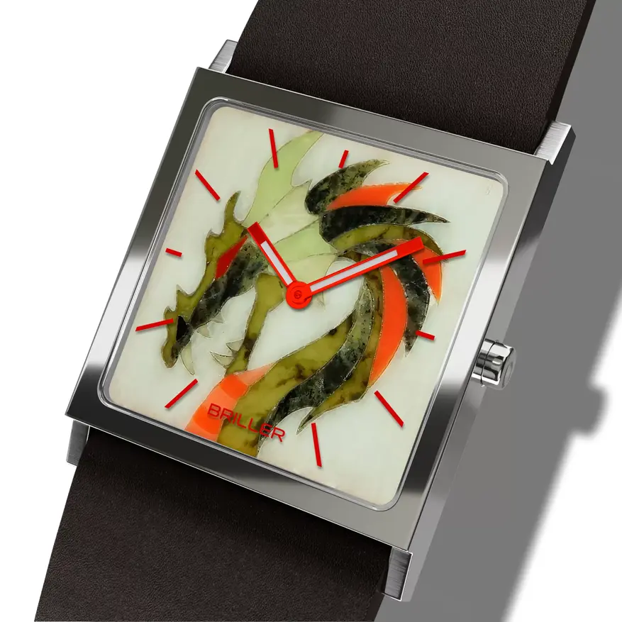 Сам дракон непростой: он выложен из натуральных минералов в технике Флорентийской мозаики. Часы имеют размеры 32 на 32 мм, швейцарский кварцевый калибр Ronda, сапфировое стекло.