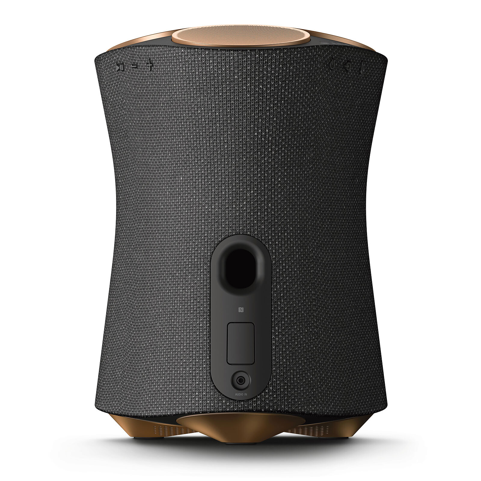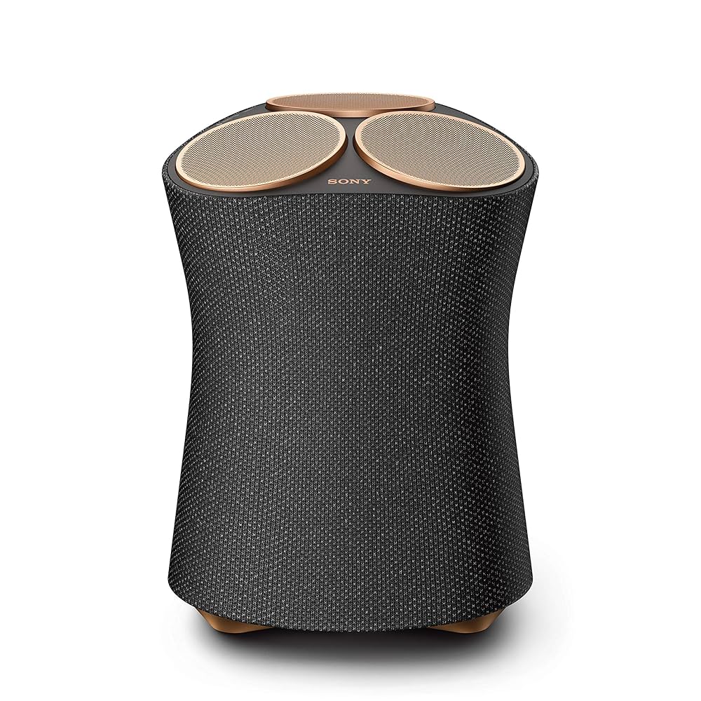 Далее идет Sony SRS-RA5000, которая придерживается совершенно иной философии. При высоте 32,9 см, диаметре около 23 см и весе 4,9 кг она выглядит, как попытка выделиться из толпы, что для устоявшегося японского бренда довольно смело.