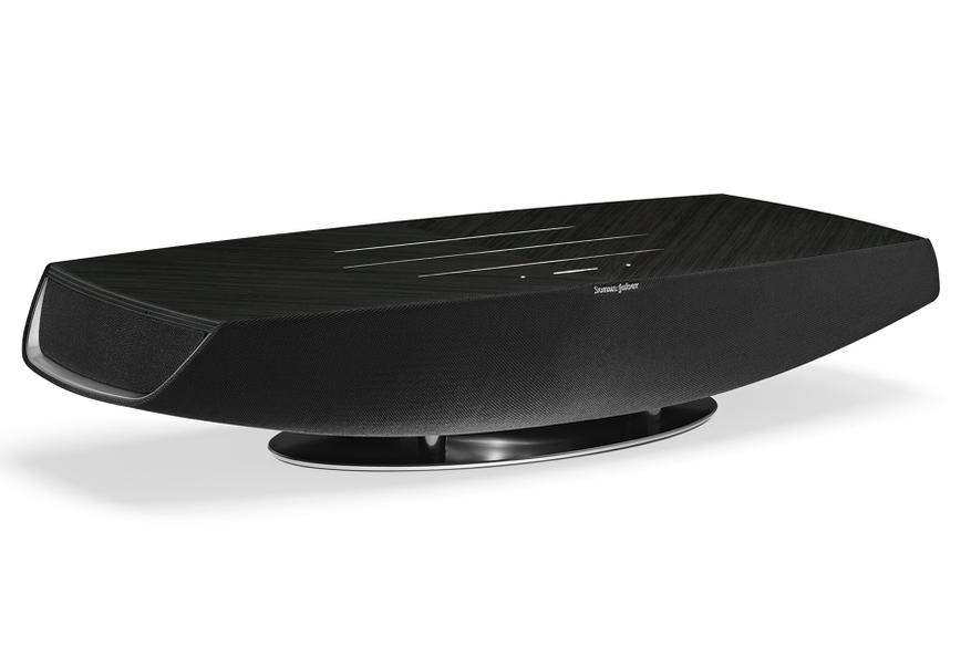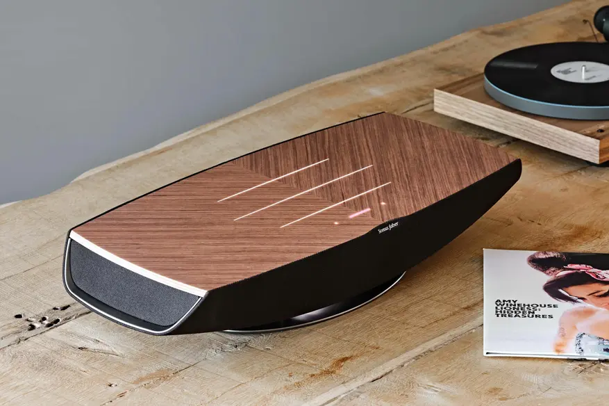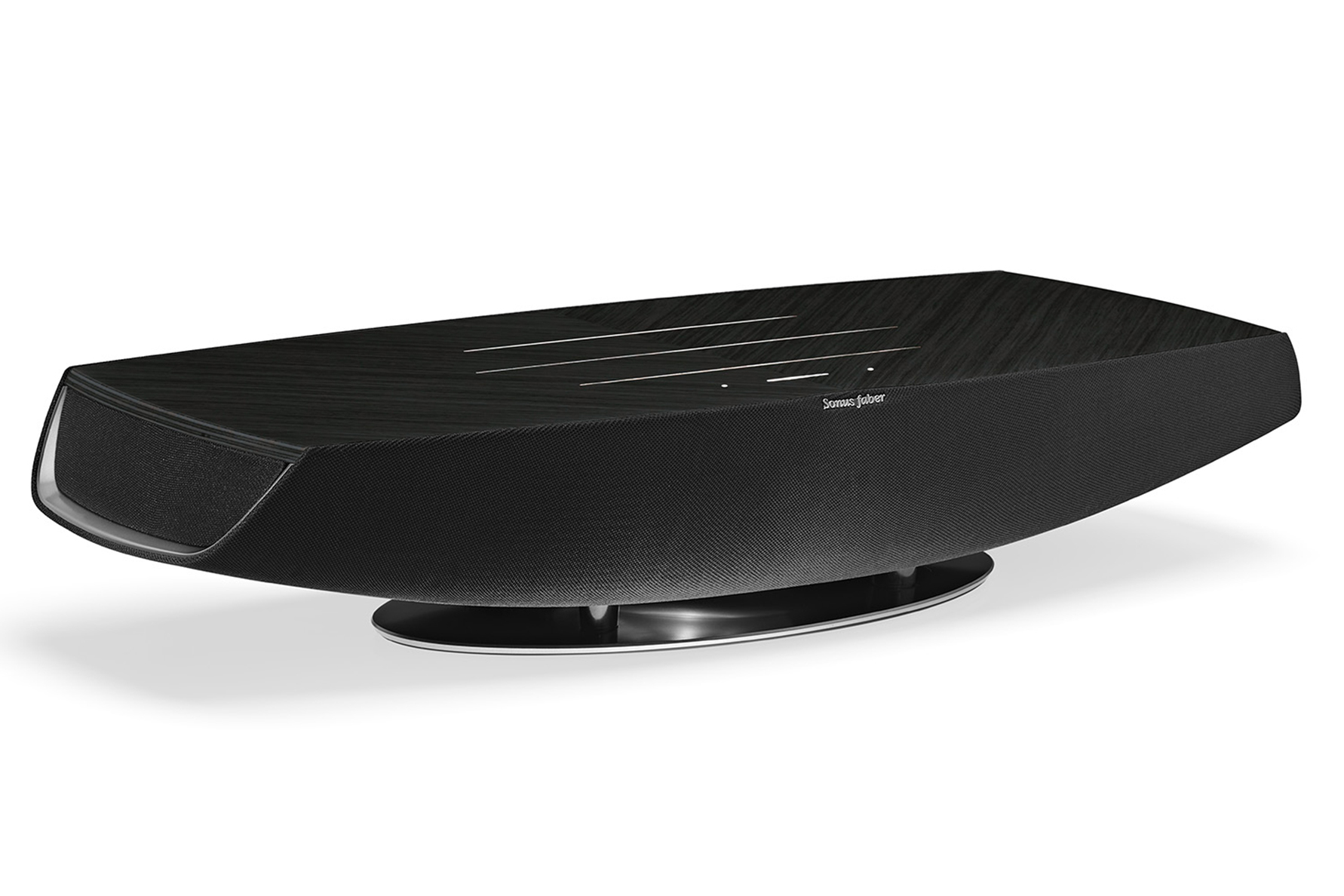 Итальянская элегантность воплощена в этой системе размером 130 x 650 x 280 мм и весом 7,6 кг. Длинный корпус из многослойного шпона ореха скрывает семь драйверов: два твитера диаметром 19 мм с шёлковыми куполами, два среднечастотника по 76 мм и два широкополосных излучателя 44,5 мм с целлюлозной мембраной по бокам, плюс центральный вуфер 165 мм с алюминиевым диффузором, направленный вниз. Всё это приводится в движение усилителем мощностью 490 Вт.