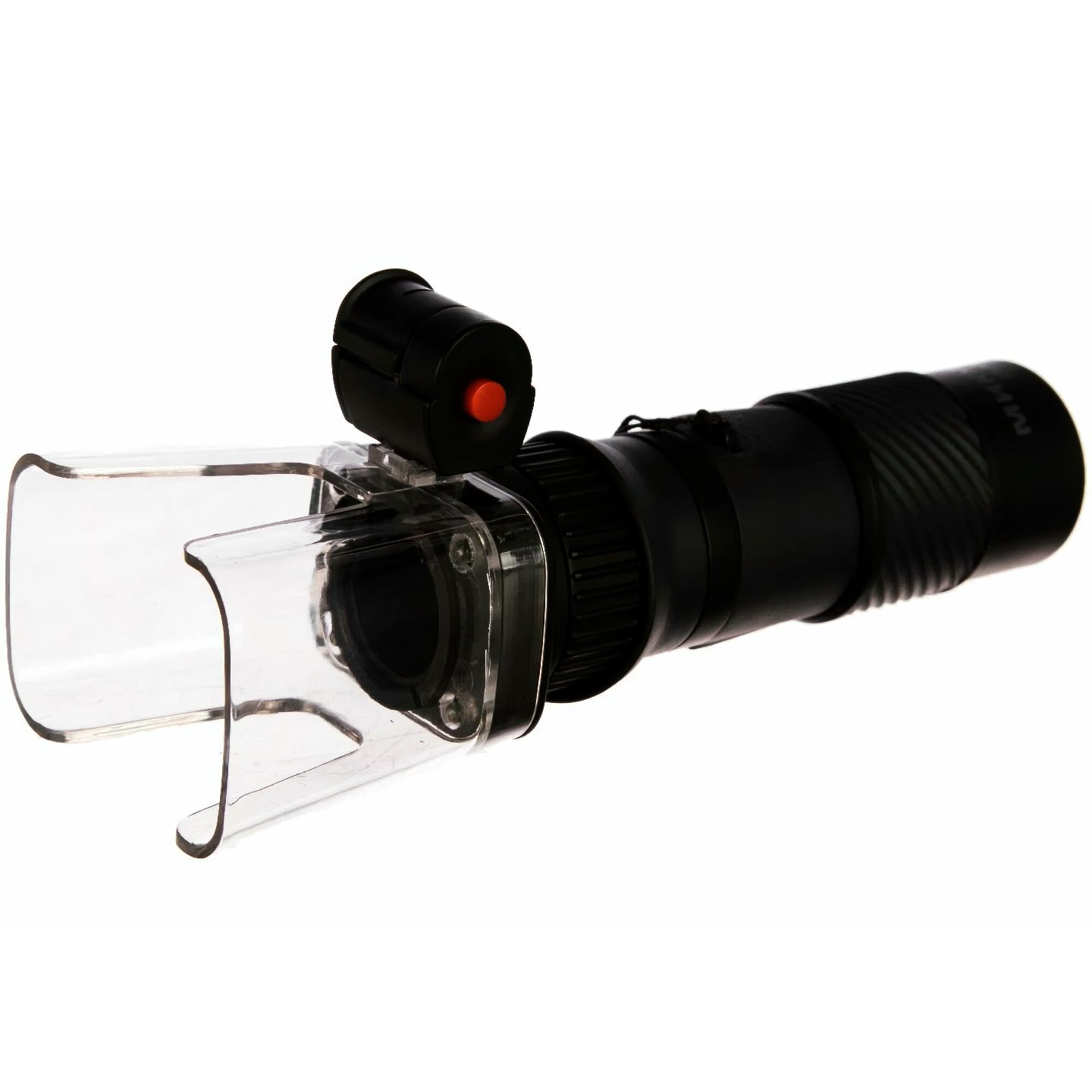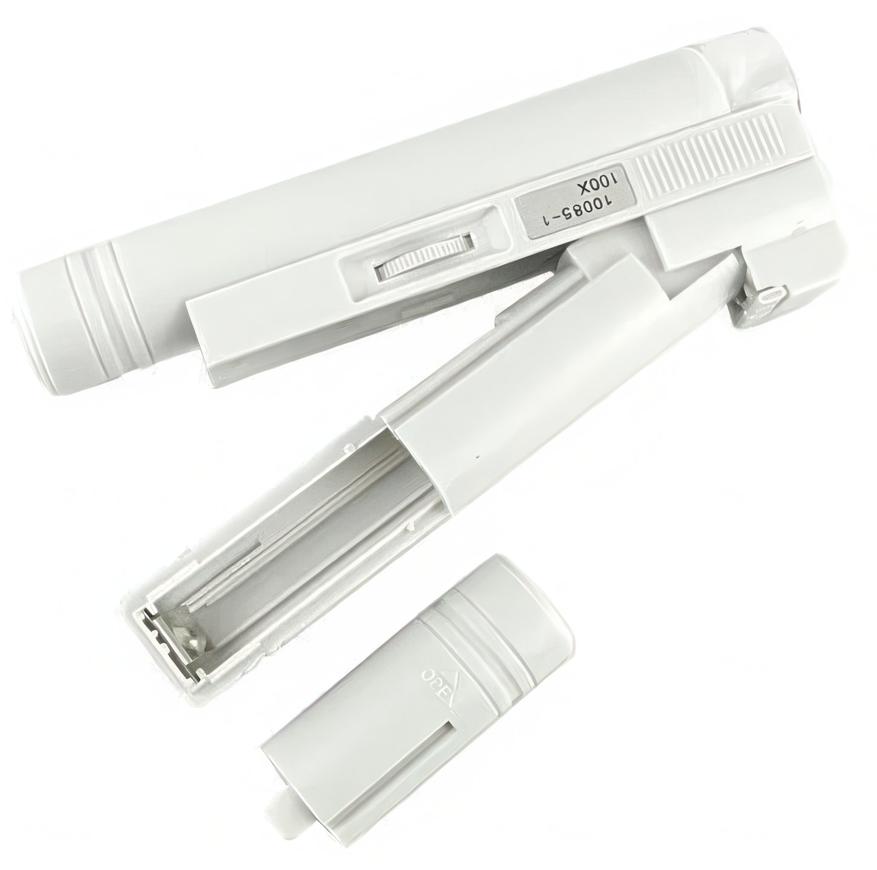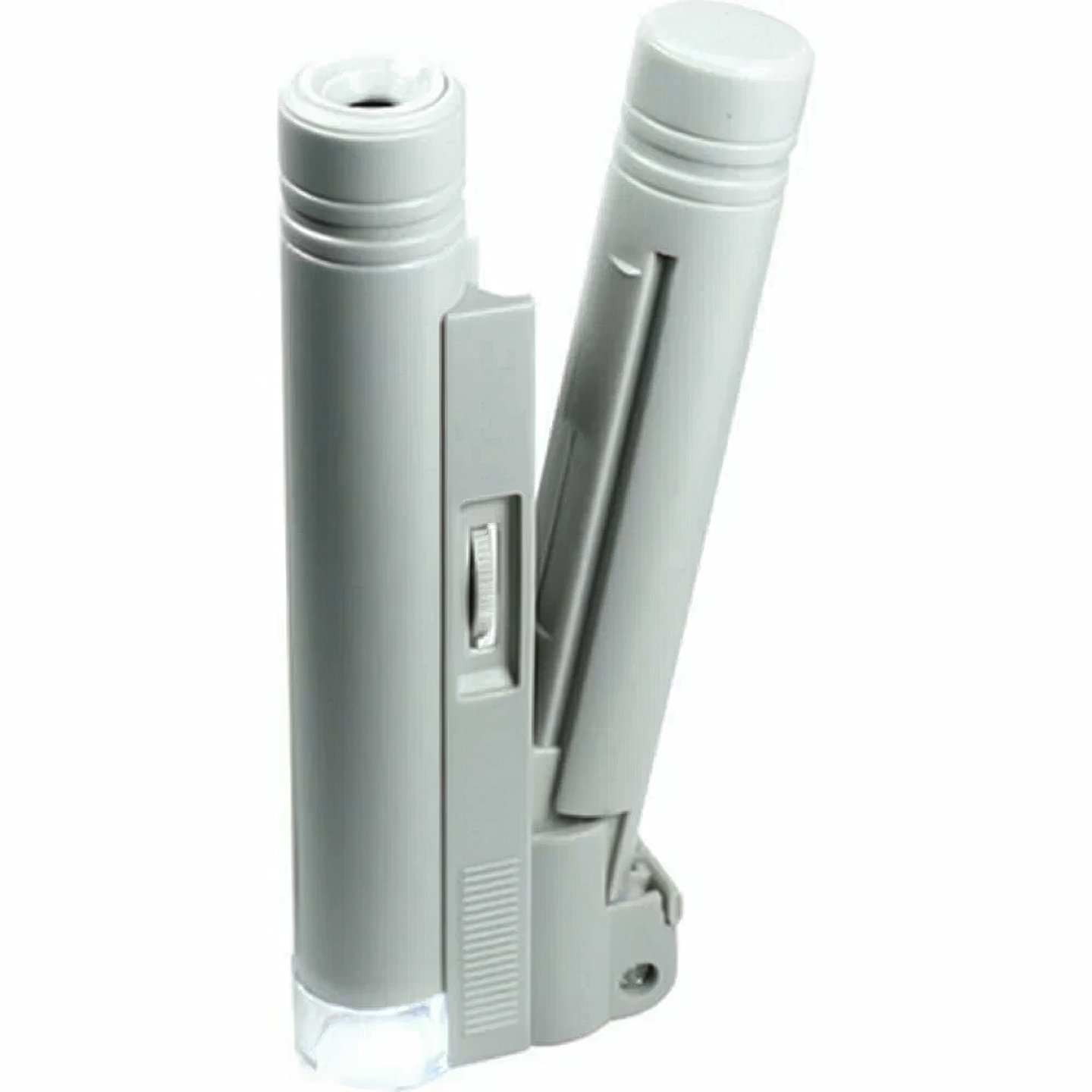 Несмотря на более внушительные габариты, данная модель привлекает внимание благодаря впечатляющему 100-кратному увеличению и мощной светодиодной подсветке. Питание осуществляется от двух батареек формата AA, которые придётся приобрести отдельно. Главное преимущество — высокая яркость и возможность регулировки угла подсветки, позволяющая полностью избавиться от бликов при рассматривании глянцевых поверхностей и получить максимально чёткое изображение.