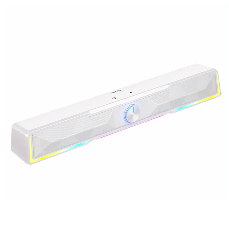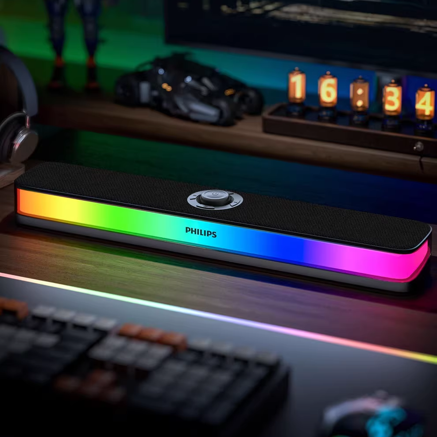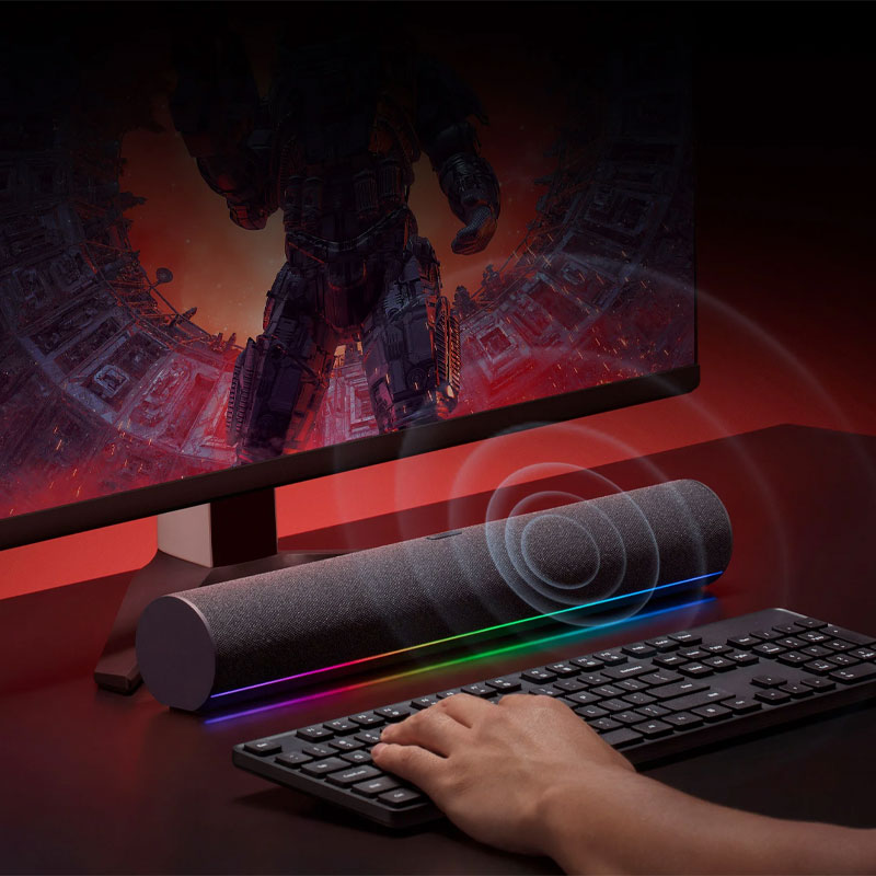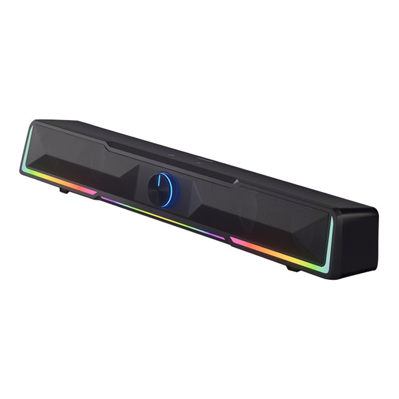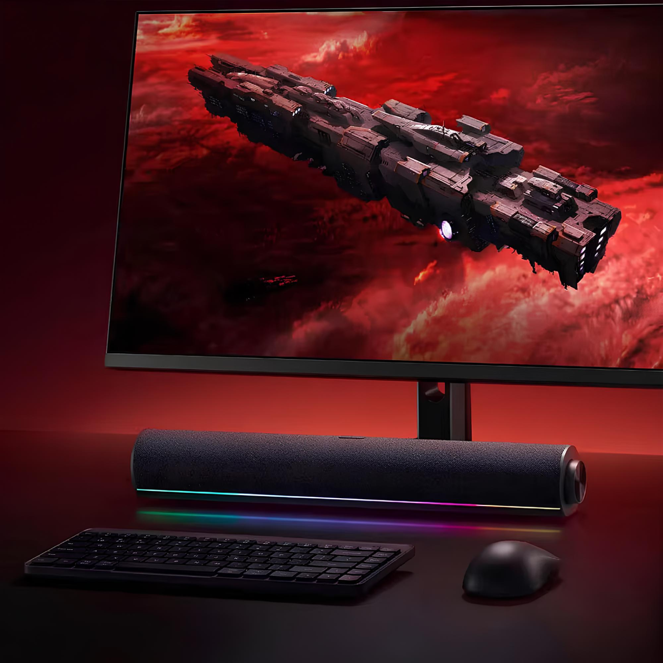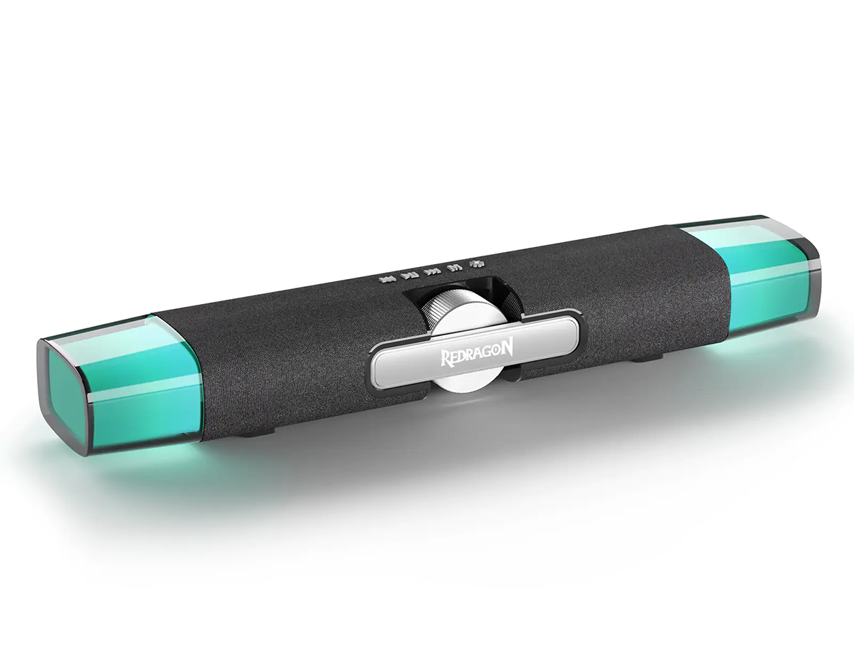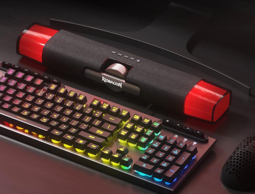 Открывает подборку саундбар от Redragon, который в силу своего необычного дизайна и яркой атмосферной подсветки станет прекрасным дополнением геймерского сетапа. Размеры в 42 x 7.8 x 5.4 см при массе 920 г делают его идеальным «подмониторным» решением.