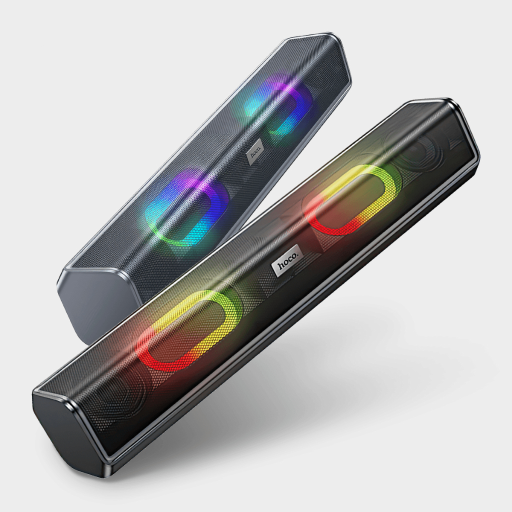 hoco BS49 — это стильная звуковая панель с габаритами 40 x 6.7 x 6.7 см при массе 735 г. У нее два 52-миллиметровых динамика мощностью по 5 Вт каждый. Их направление вверх оптимально для размещения саундбара непосредственно под монитором. Модуль Bluetooth 5.1 обеспечивает стабильное подключение в радиусе до 15 метров.