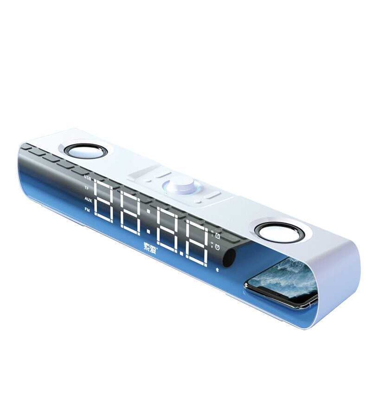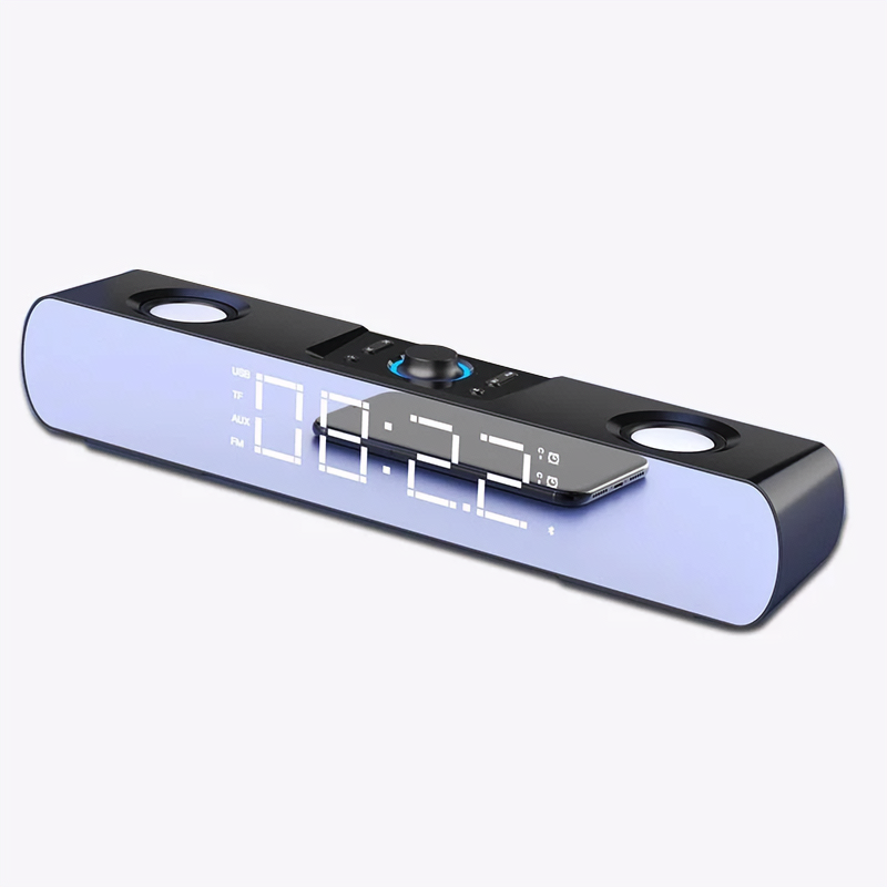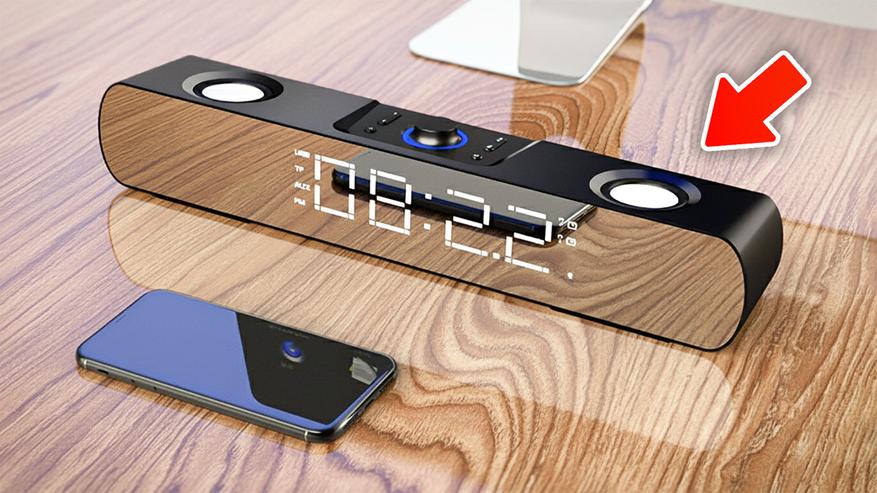 Далее идет любопытное устройство с LED-дисплеем на зеркальной лицевой панели. Размеры 39.3 x 6.8 x 6.8 см при весе 650 г делают его оптимальным вариантом для небольшого компьютерного стола. Двухканальная система из пары динамиков и пары пассивных излучателей с общей мощностью 6 Вт при частотном диапазоне 100-20 000 Гц обеспечивает приличное качество звучания для небольшой комнаты.