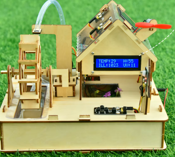 Ещё одна модель дома, работающая на возобновляемых источниках энергии: в комплекте идет солнечная панель и ветряной генератор. Набор обучает автоматизации процессов, таких как автоматический полив растений по датчику влажности почвы и мониторинг погодных условий с выводом данных на дисплей. Устройство наглядно демонстрирует принципы работы «зеленых» технологий, а управление всеми модулями осуществляется через плату Arduino, которую можно программировать как кодом, так и через понятные графические блоки.