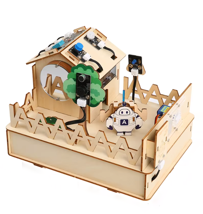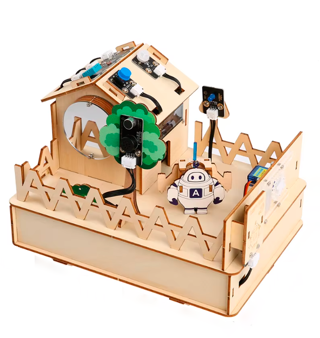 Детализированная деревянная модель дома, оснащенная датчиками света, движения и температуры. Он включает в себя 16 обучающих проектов, позволяющих реализовать функции настоящего «Умного дома», такие как управление светом, сигнализация, контроль доступа RFID и дистанционное управление по Wi-Fi.