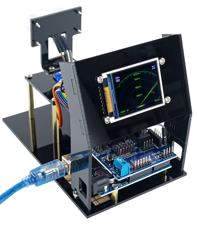 Модель ультразвукового локатора, способного обнаруживать объекты в пространстве. С помощью сервопривода радар вращается, сканируя окружающую обстановку, а полученные данные в реальном времени отображаются на ярком дисплее в виде графической карты. Проект наглядно демонстрирует принципы работы эхолокации и систем обнаружения.
