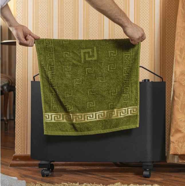 Это конвектор на 2000 Вт, рассчитанный примерно на до 25 квадратов, и сделан он не просто «чтобы грел», а с удобными мелочами, которые в жизни реально помогают. В глаза сразу бросается перекладина сверху, на неё можно повесить мокрую одежду или полотенце. И что приятно, она не торчит как лишняя деталь: не нужна, сложил или снял, и прибор снова выглядит аккуратно.