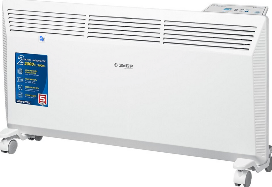 Это электрический конвектор на 2000 Вт, рассчитанный на комнаты примерно до 25 м². Такой мощности хватает, чтобы помещение прогревалось уверенно и без долгих ожиданий.