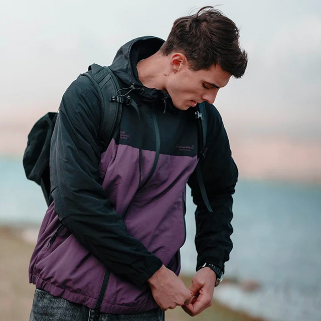 Защита от воды и ветра обеспечивается: водоотталкивающими свойствами ткани снаружи, клапаном поверх центральной молнии, капюшоном (он съемный и имеет регулировку объема), регулировкой объема манжет (снабжены кнопками), молнии внешних карманов — в клапанах.