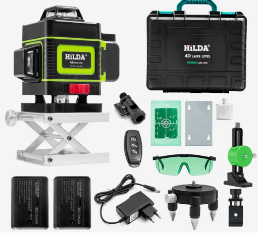 Проецирует четыре линии по 360 градусов: две горизонтальные и две вертикальные, что позволяет одновременно выполнять разметку пола, потолка и стен, экономя значительное время. Устройство оснащено самовыравнивающимся маятником, который позволяет быстро подготовить уровень к работе, компенсируя небольшие наклоны поверхности. Зеленый луч, который используется в этой модели, гораздо ярче и лучше виден в условиях повышенной освещенности по сравнению с красным, что особенно актуально для больших помещений или работ на улице. В комплект часто входят аксессуары, такие как пульт управления, магнитный кронштейн и несколько аккумуляторов, делая его полностью готовым к работе.