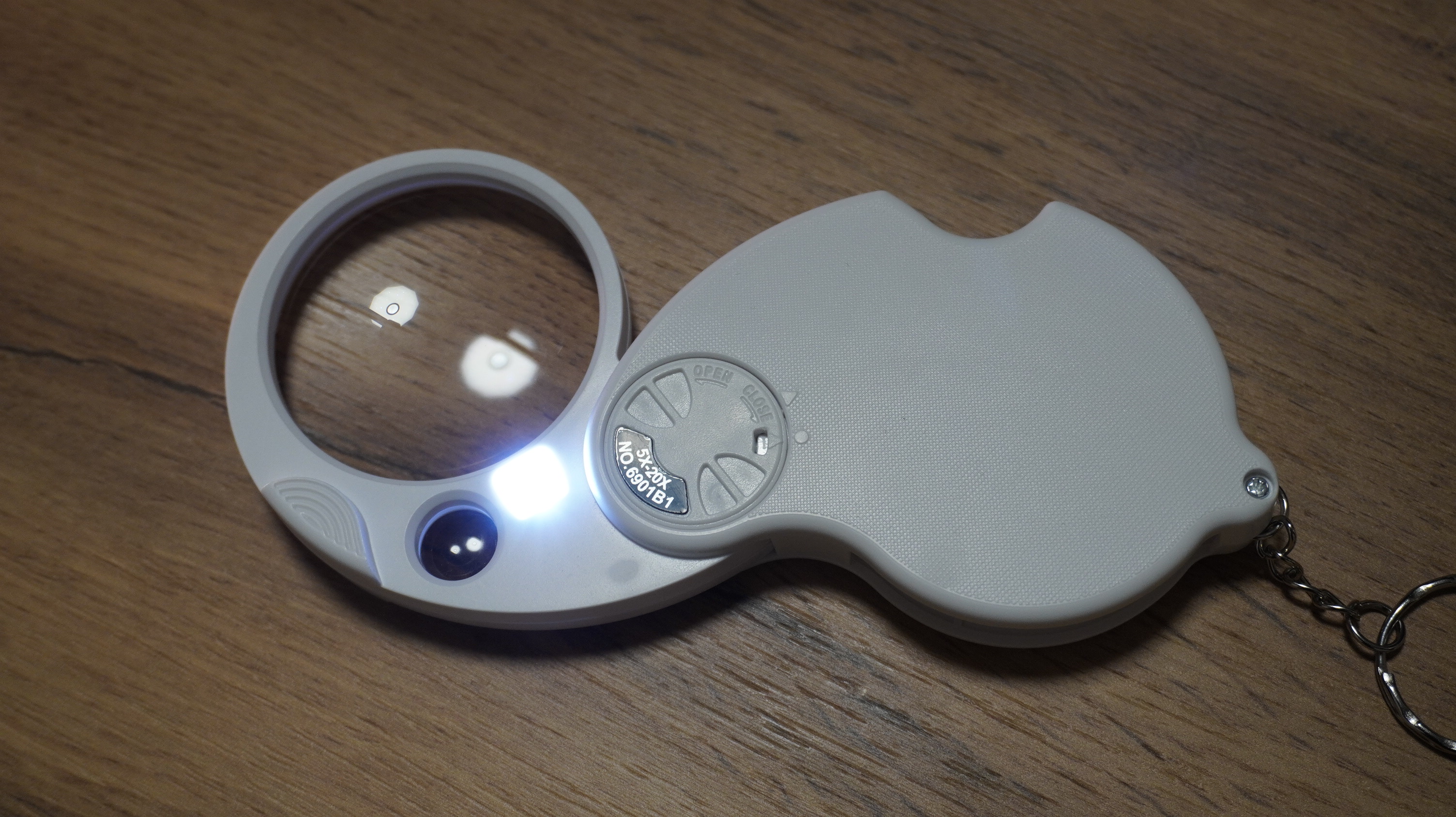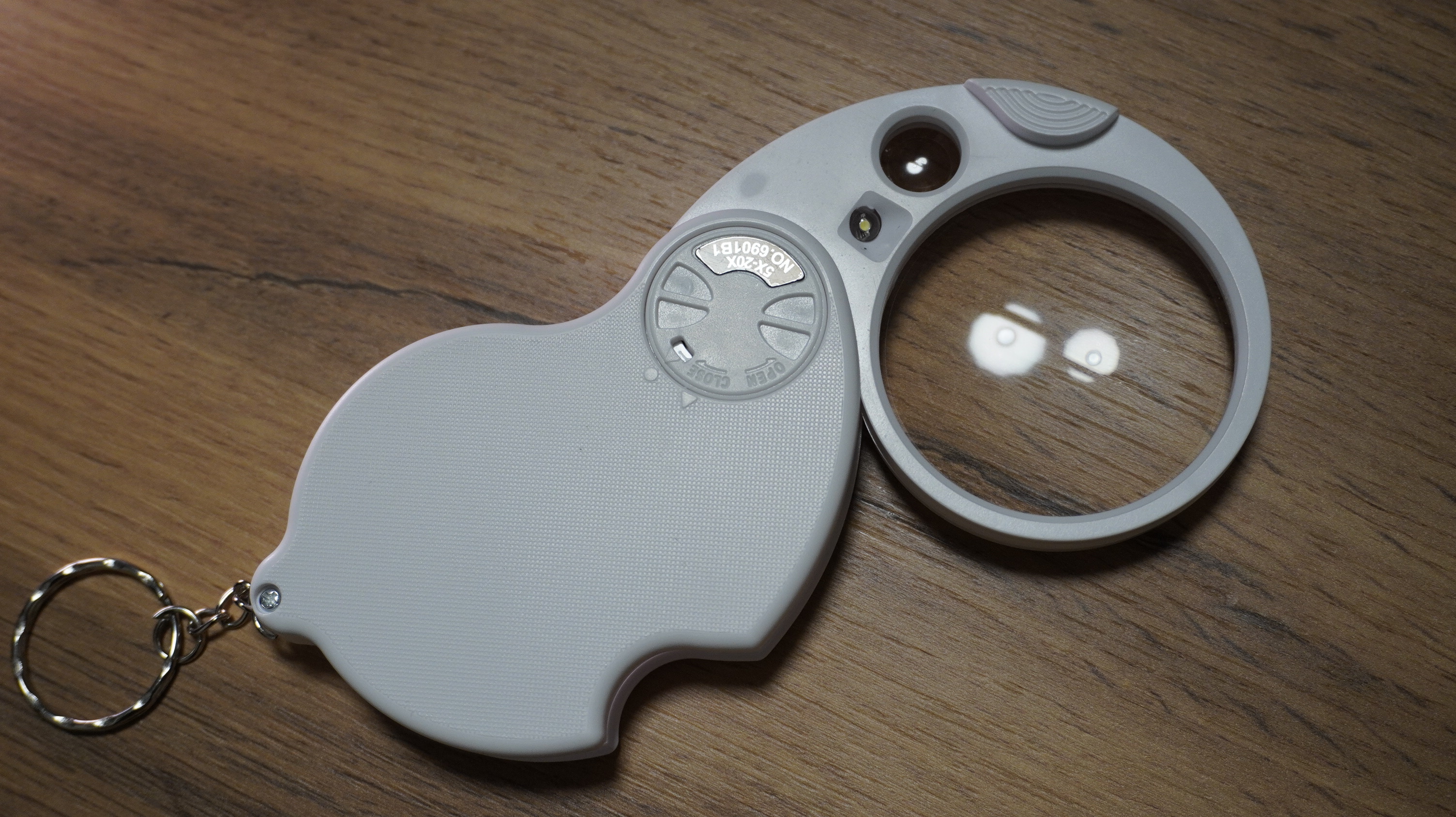 Интересная модель. В брелоке есть две линзы: одна увеличивает в 5 раз, другая в 20 раз. Первая подходит для увеличения нескольких строк текста, а вторая — для мелких деталей.