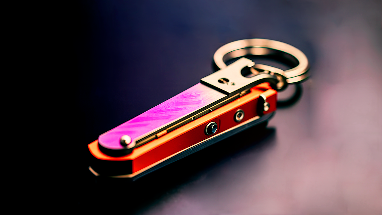 Этот брелок можно купить в трёх разных расцветках: серебристо-чёрной, серебристо-золотой и серебристо-градиентной. Изготовлен из нержавеющей стали.