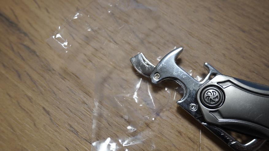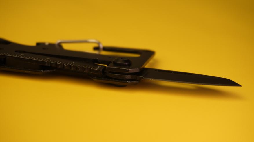 У него самый короткий ножик — длина около 1,1 см. Он не острый, а поточить его — ещё та задача. Даже для мелких задач его «хватает» с трудом. Например, открыть коробку (разрезать скотч) с его помощью получилось, но только со 2-3 попытки.