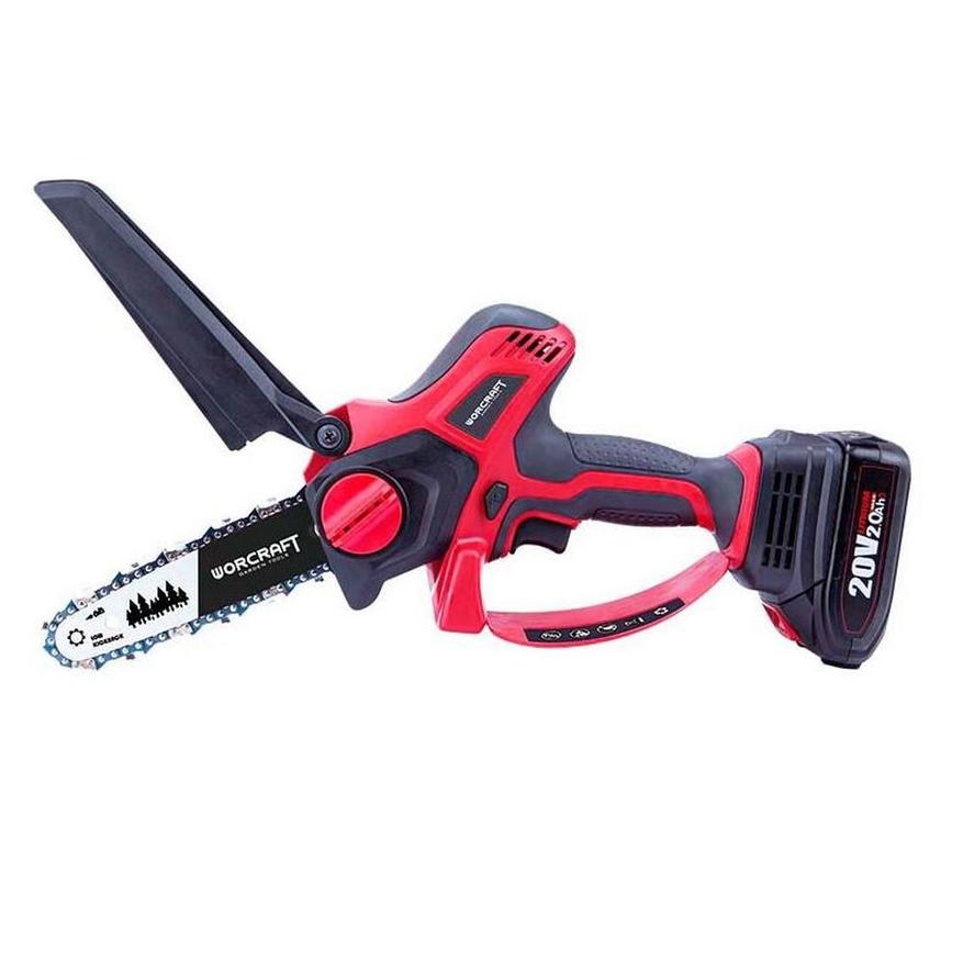 Вариант цепной мини-пилы сучкореза с высокой заявленной мощностью 800Вт. Длина шины составляет 150мм (6″), шаг цепи: 1/4 дюйма. Двигатель: бесщеточный. Скорость движения цепи ниже, чем у предыдущих моделей: 7,5 м/с. В комплекте поставляется всего одна батарея 2Ач (20 вольт), чего для такой заявленной мощности может хватить на достаточно небольшой объем работы. На корпусе есть блокировка от случайного включения, а также пружинный кожух над цепью. В наборе с инструментом поставляются: кейс, аккумулятор, чехол на цепь, зарядное устройство, емкость с маслом 100мл. Вес: 1,6 кг.