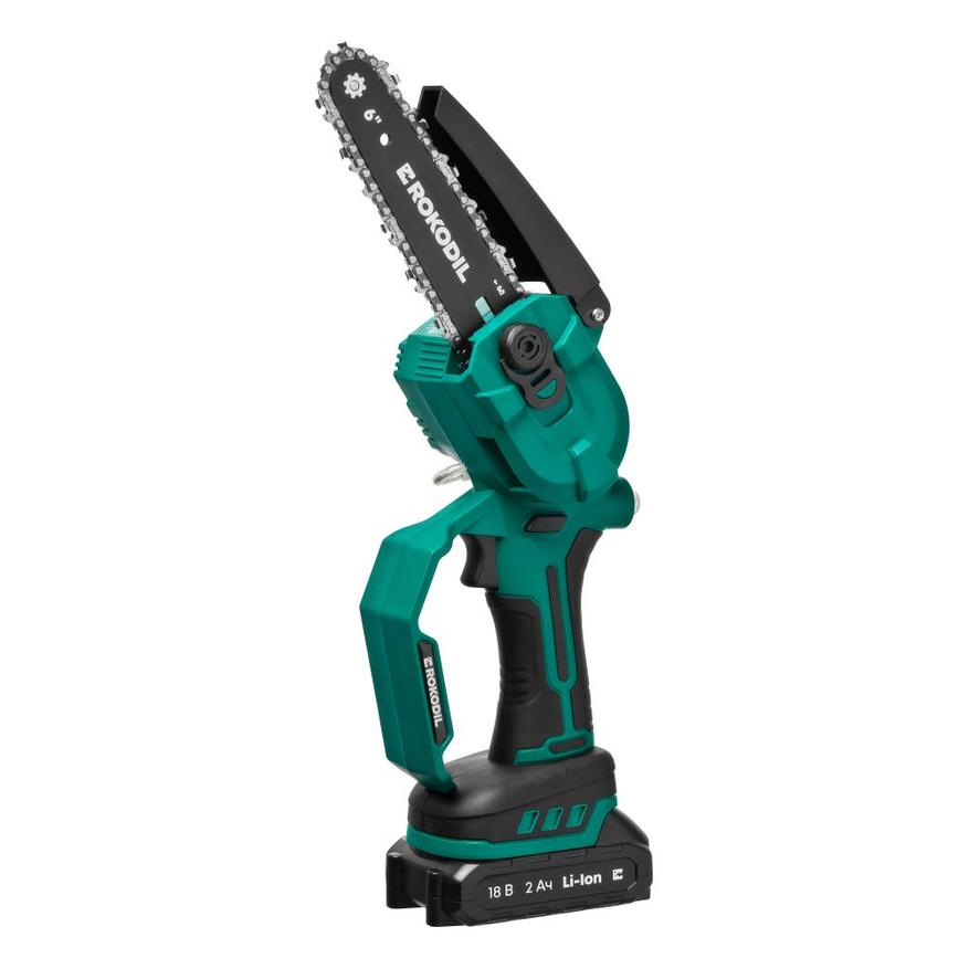Интересный вариант цепной мини-пили от бренда Rocodil. Компактный универсальный инструмент для разнообразных дачных работ, с работой от аккумулятора 18 вольт и шиной цепи 150мм (6″). Отлично подойдет для обрезки сучков, веток, распилу вагонки, заготовки дров для шашлыков и других подобных мероприятий. Корпус имеет прорезиненные вставки на рукоятке для удобного хвата и комфорта в работе. Заявленная мощность устройства составляет 700Вт, установлен бесщеточный двигатель, на данный момент являющийся оптимальным вариантом по уровню шума и расходу энергии батареи. Скорость движения цепи: 8 м/с. Есть защита от случайного включения. Полуавтоматическая подача смазки к цепи из маслозаливного бачка. Безопасность обеспечена пружинным защитным кожухом. Вес: 1,4 кг. Комплектация солидная, помимо инструмента в набор входят: 2 аккумулятора 2Ач с зарядным устройством, 2 цепи 1/4″, щетка, напильник, очки и масленка. Все это в пластиковом кейсе. Гарантия: 5 лет.