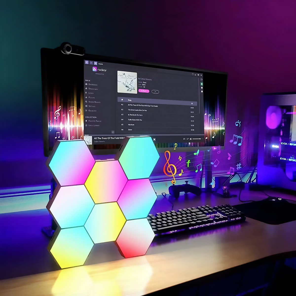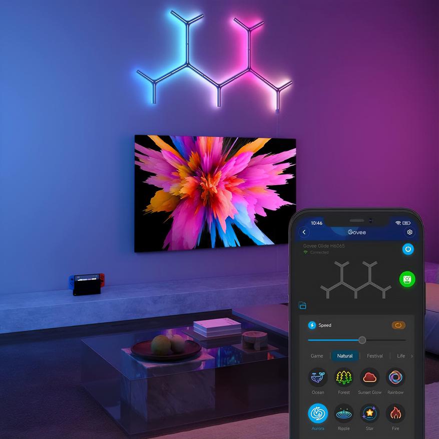 Светодиоды Govee Glide могут мерцать и менять цвет в такт воспроизводимой в помещении музыке, также есть вариант синхронизировать их с различной игровой периферией (обладающей собственной RGB-подсветкой) через Razer Chroma.
