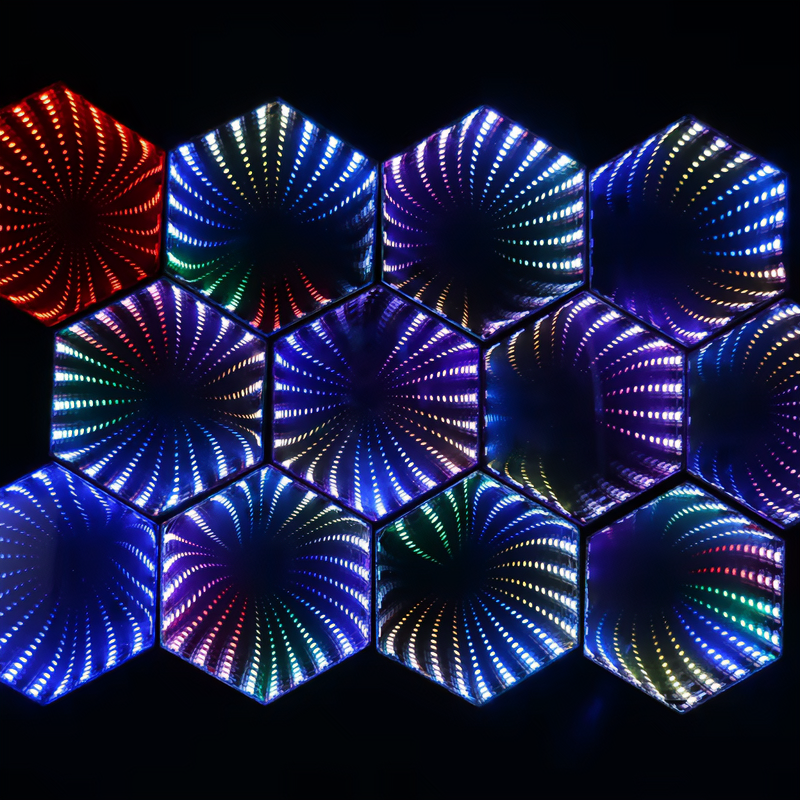 Следующий «премиальный» вариант световых шестиугольных панелей продается на AliExpress лишь поштучно. Эту модель отличает от многих других не только зеркальный дизайн, но и довольно крупные размеры каждого сегмента. Длина большой диагонали составляет 15.5 см, малая диагональ — 13.5 см, а толщина — 3.5 см.